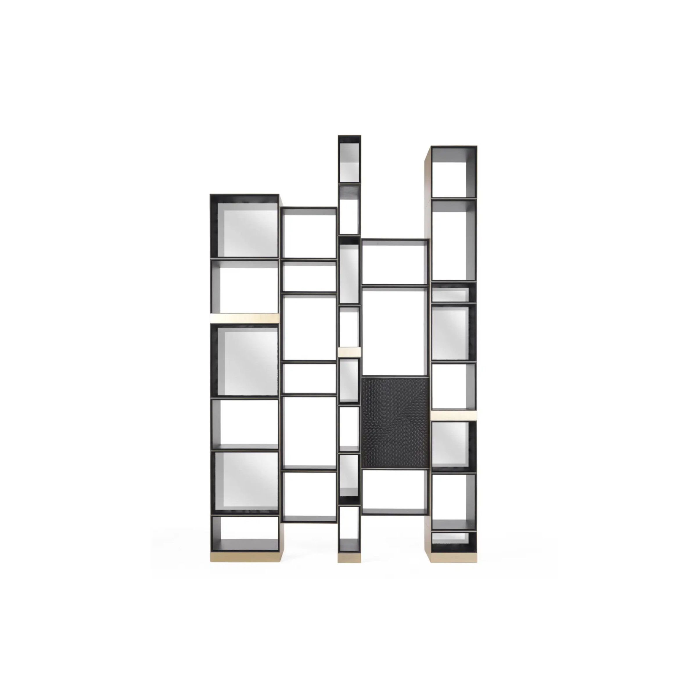 Elegant lines and sculptural shapes for the iconic Acapulco bookcase, upholstered in the new Wild Tiger velvet for the shelves and in leather with stella quilting for the doors. Thanks to its contemporary design, the bookcase presents itself as a scenographic and decorative element. The possibility of double-sided use offers endless interpretative possibilities, allowing placement also from the center of the room or as a dividing wall.