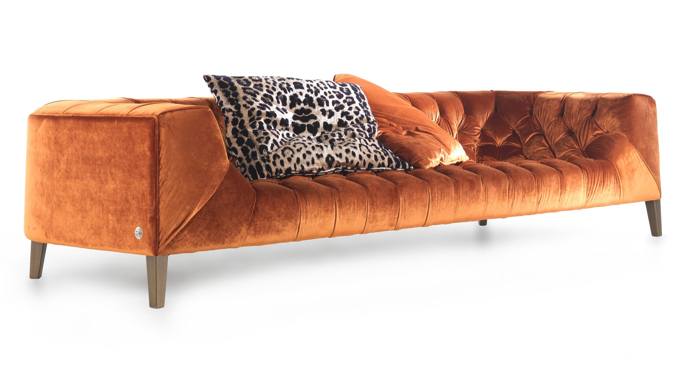 Vintage style and contemporary charm coexist in the Blake sofa. This striking piece of furniture stands elegantly on metal feet, available in glossy or brushed finishes, imparting a touch of sophistication to the living room. The possibility to choose from our carefully curated selection of fabrics or leathers allows to tailor the aesthetic to your personal style.