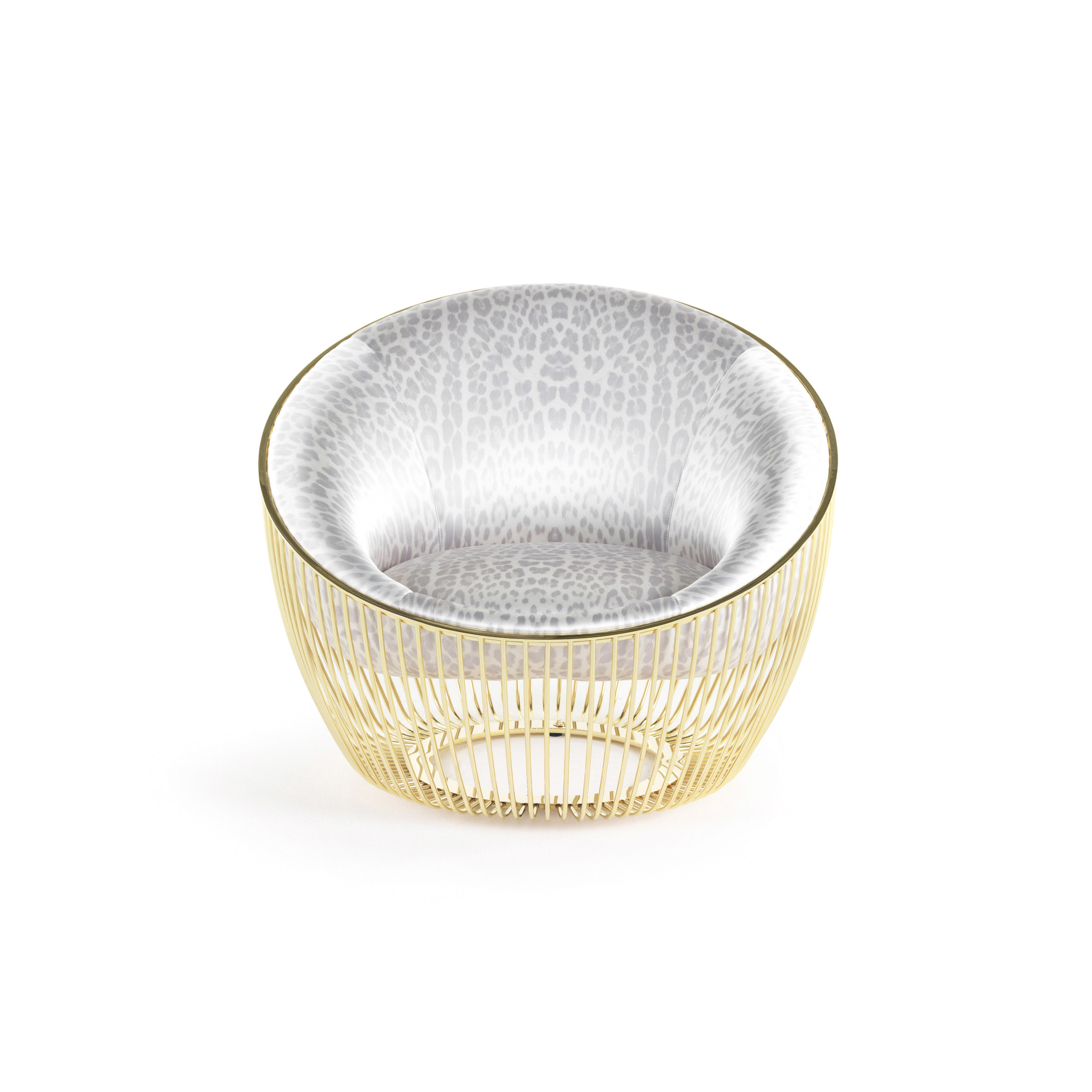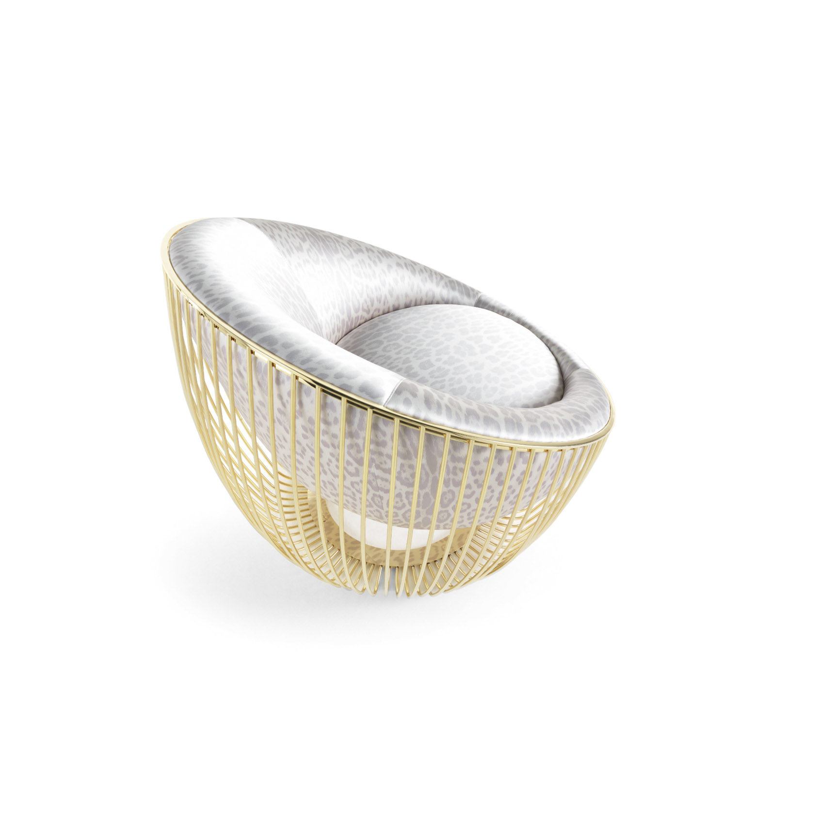 A refined and sophisticated “nest” armchair, which combines the brightness of the gold finish with the exuberance of the silks from the collection. Cosmopolitan is a piece of furniture that captures the attention, responding to a dynamic and unexpected interpretation of the living space.