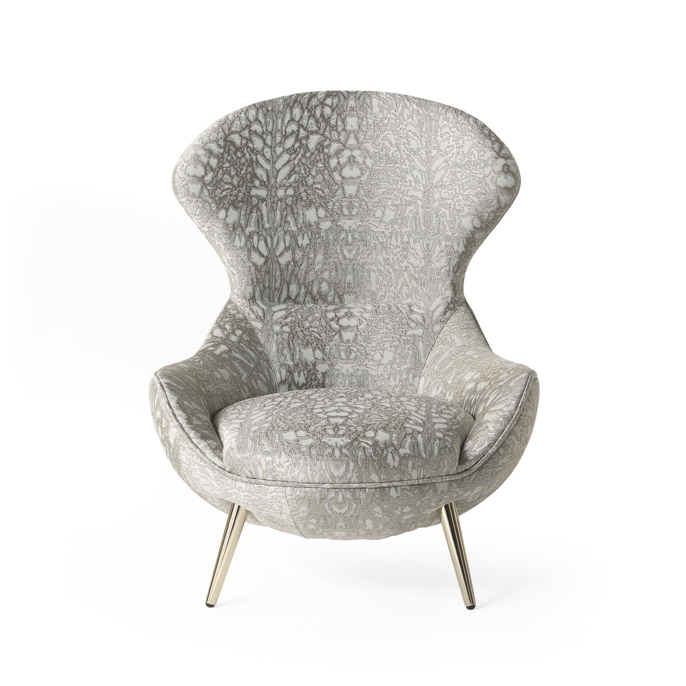 A dynamic and embracing shape with sinuous lines for the Curaçao armchair. With four sloping legs with references to the Fifties, the armchair is proposed in different fabrics of the collection, included the new zebra silk in a bright citron shade, that perfectly fits in rooms with an urban glam appeal.