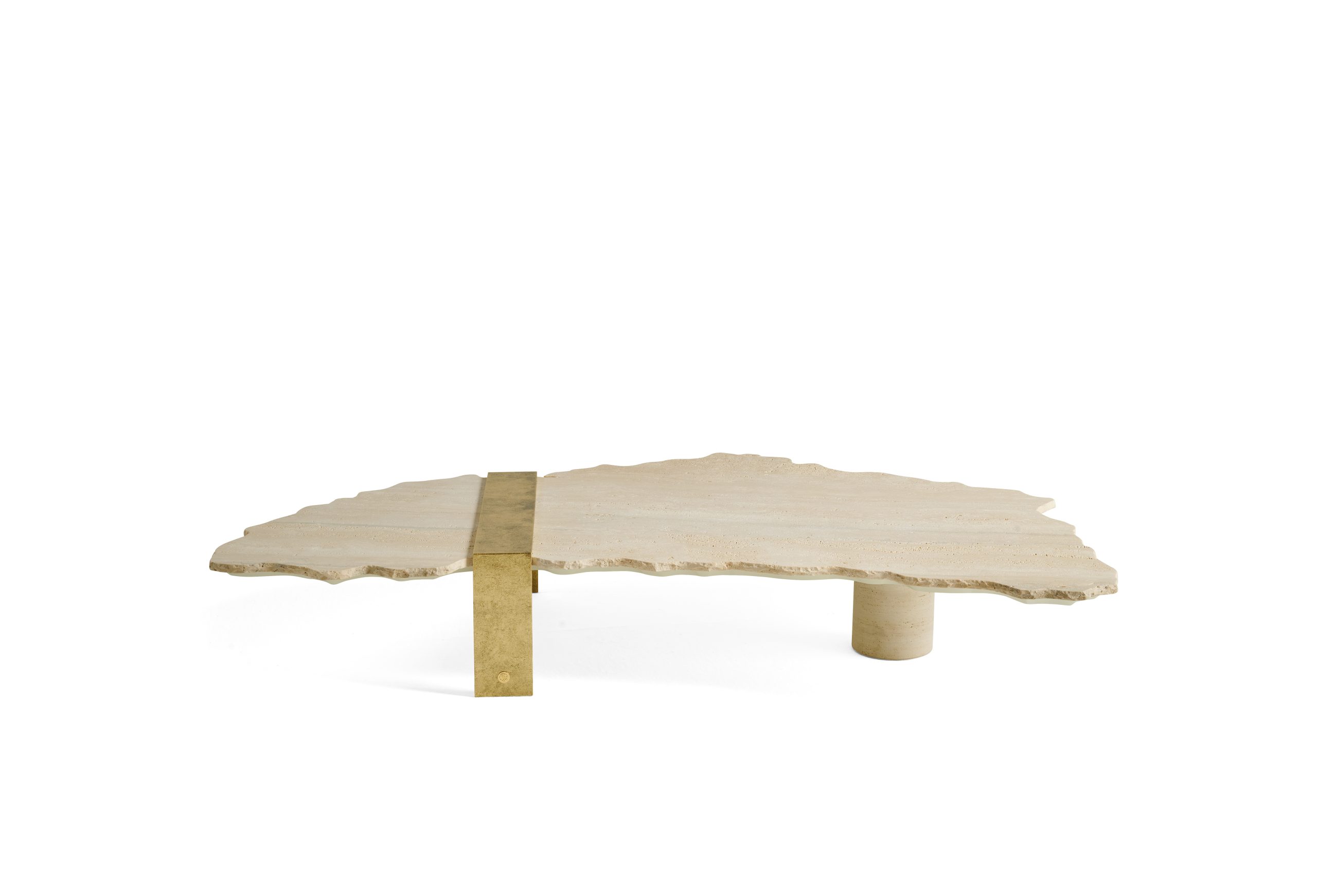 The elegance, luxury and refinement typical of Roberto Cavalli Home Interiors find a new, authentic and essential form of expression in the Galite low table. Made from raw materials that recall the roughness of nature, Galite boasts a sculptural and scenographic charm. The irregular shape of the marble top and the side band with a rough golden finish take us back to the rocky surface of Galite islands, to the unevenness of the land and to the brightness of the beaches.