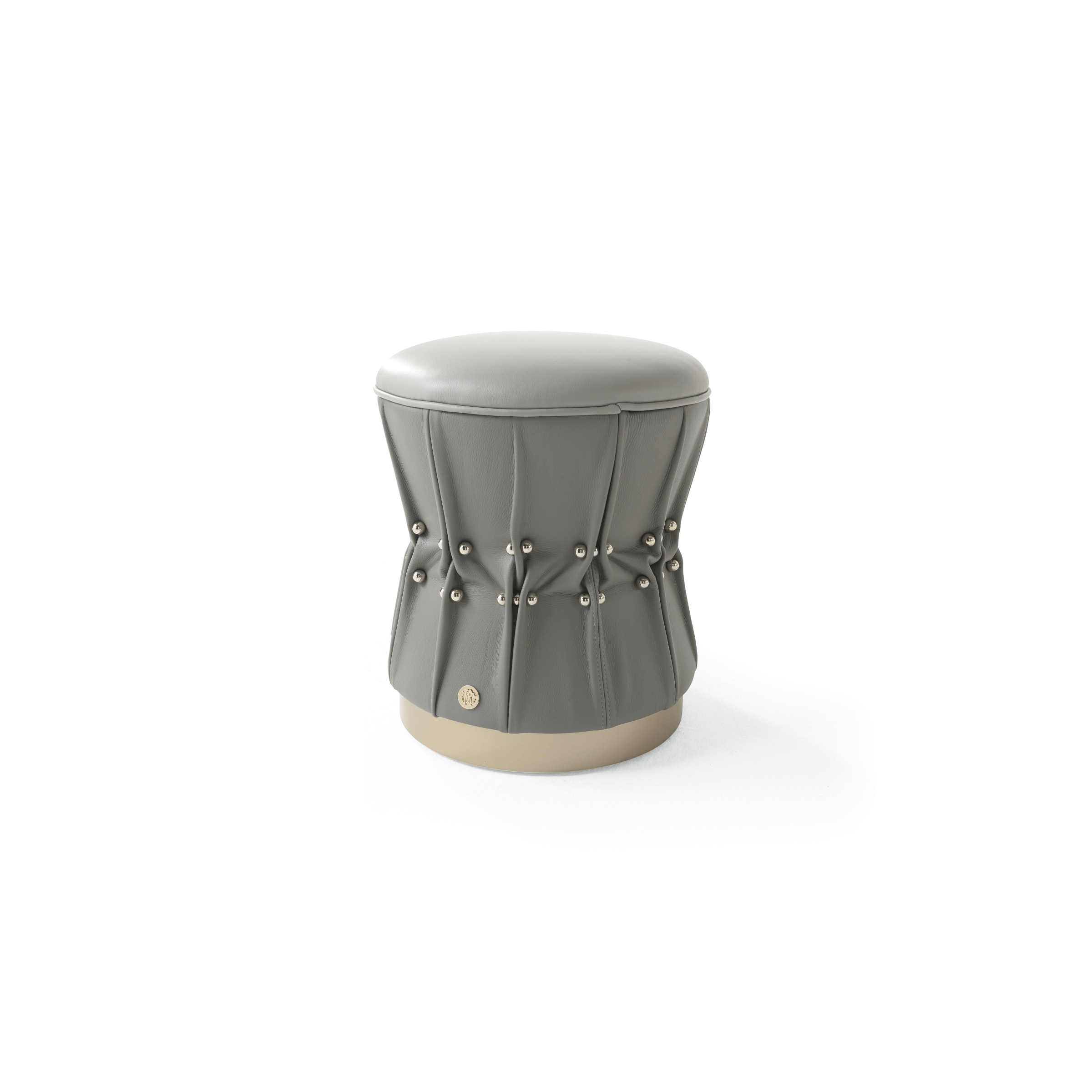 Inanda poufs, with their appealing design, are upholstered with the fabrics of the collection and characterized by a leather exterior embellished with special pleating and metallic piercings, recalling Roberto Cavalli fashion Maison’s leather accessories.