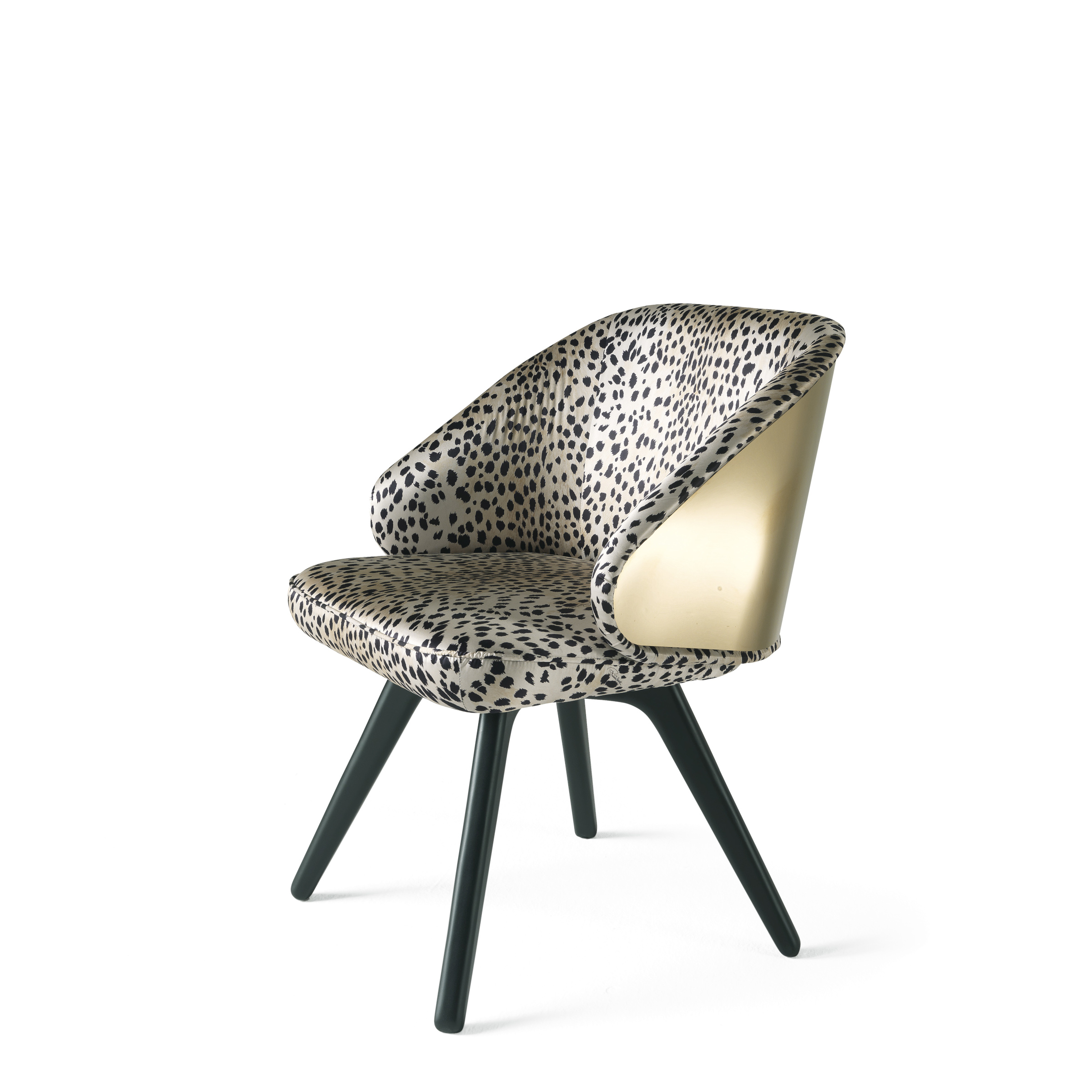Appealing design and vintage lines for the Key West chair. Featuring sinuous and rounded shapes, it boasts an enveloping back with gold finishing and a comfortable seat upholstered with the new Wild Jaguar print. Sensuality, warmth and charm: the perfect ingredients to create a seductive and relaxing setting in your home.
