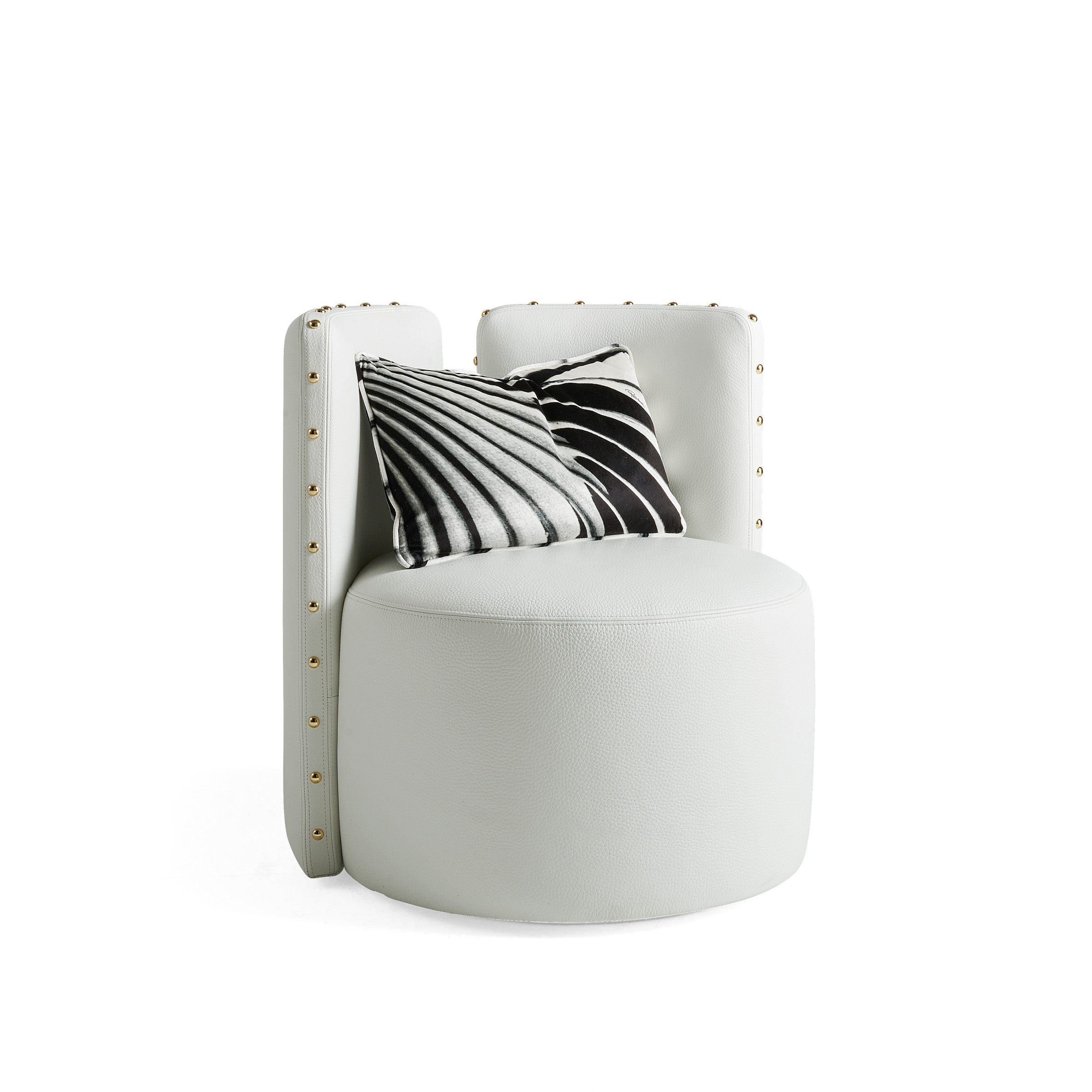 Manda is an inviting and comfortable swivel armchair, characterized by soft and rounded shapes. The original design, given by the back composed of two rectangular elements positioned side by side, is enhanced by the decorative studs that run along the external perimeter.