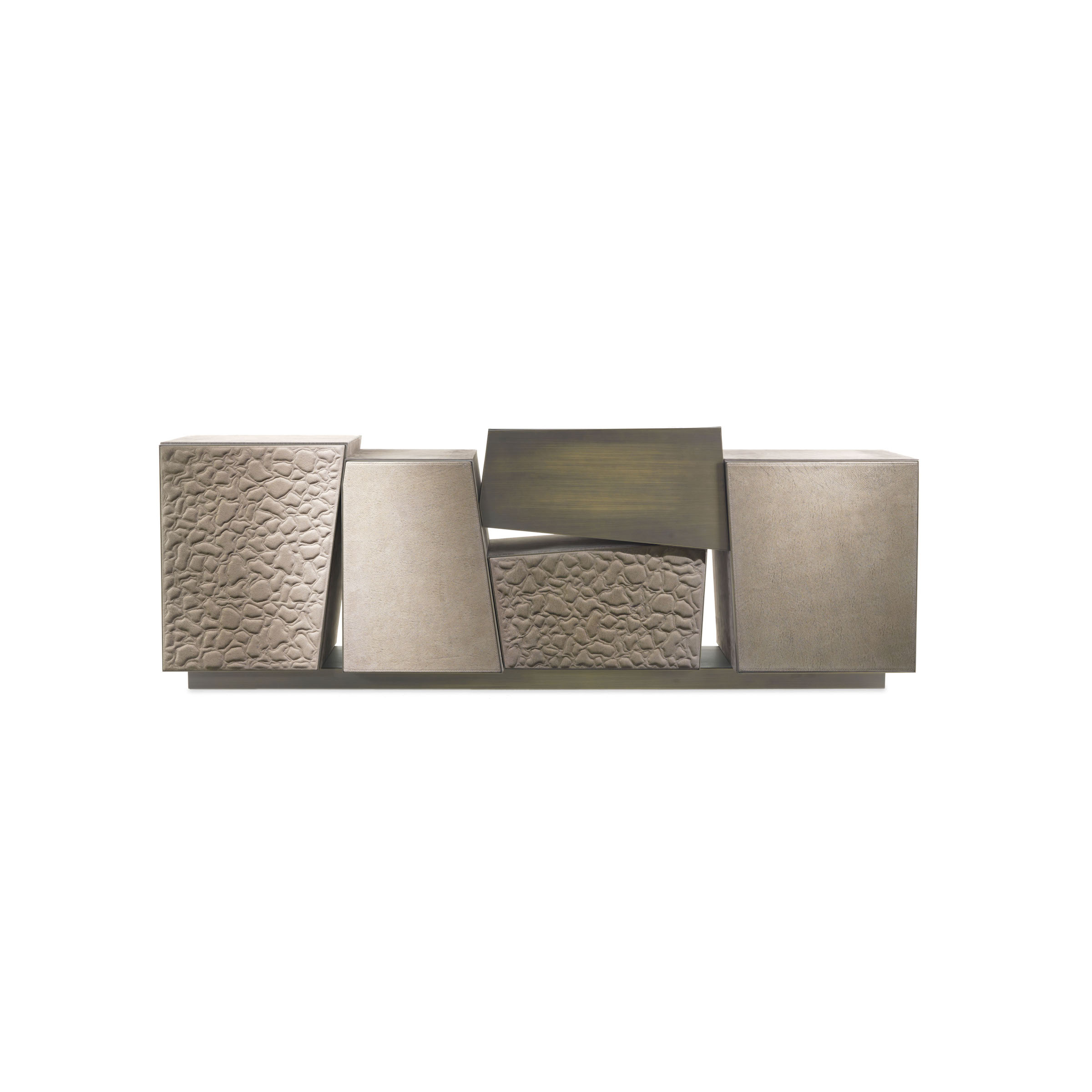 The irregular beauty of nature is the protagonist of the Martinica sideboard, a special design piece resulting from the combination of asymmetric elements, different in colours, dimensions and decorations. An impressive mix made of precious materials and a perfect solution for settings with a contemporary appeal.