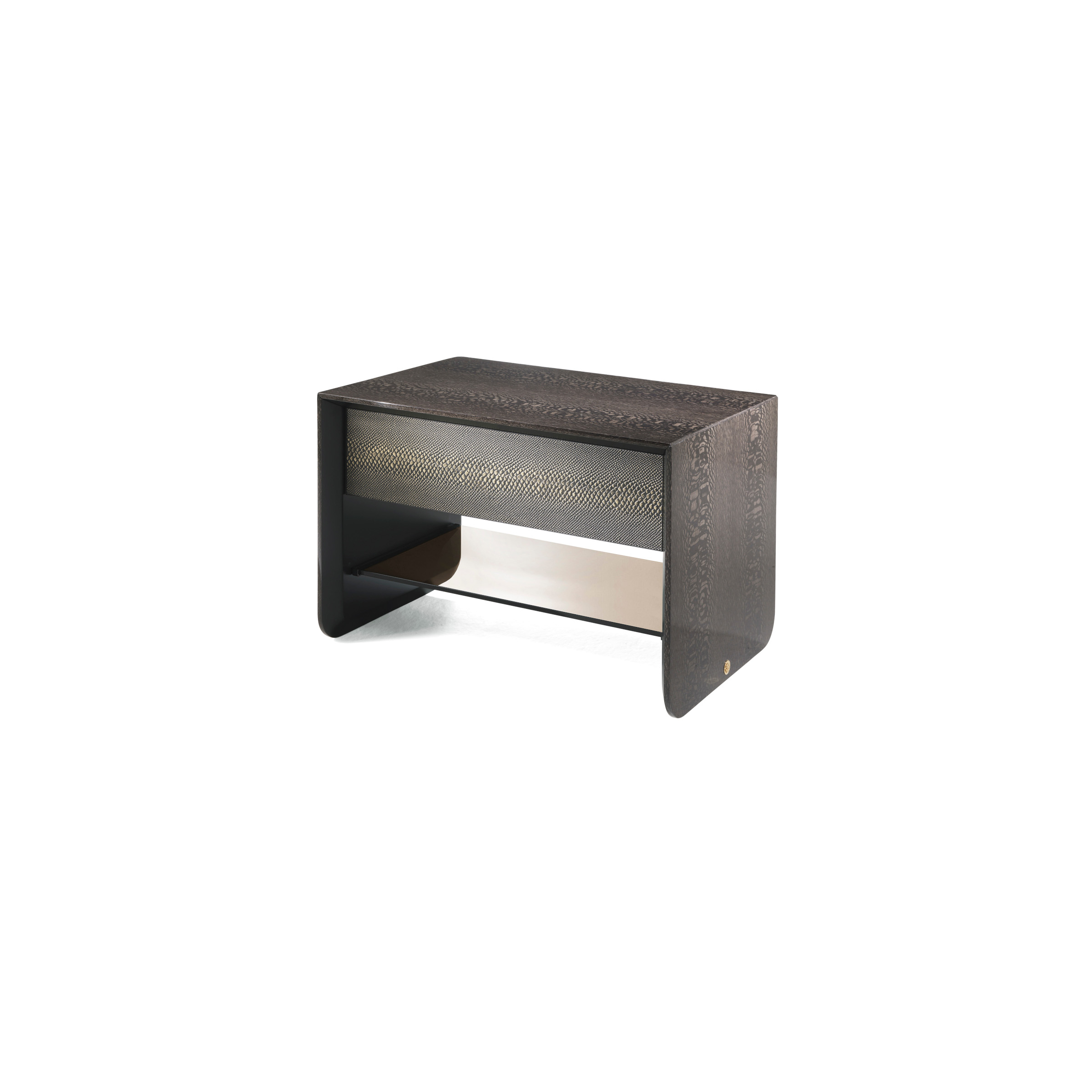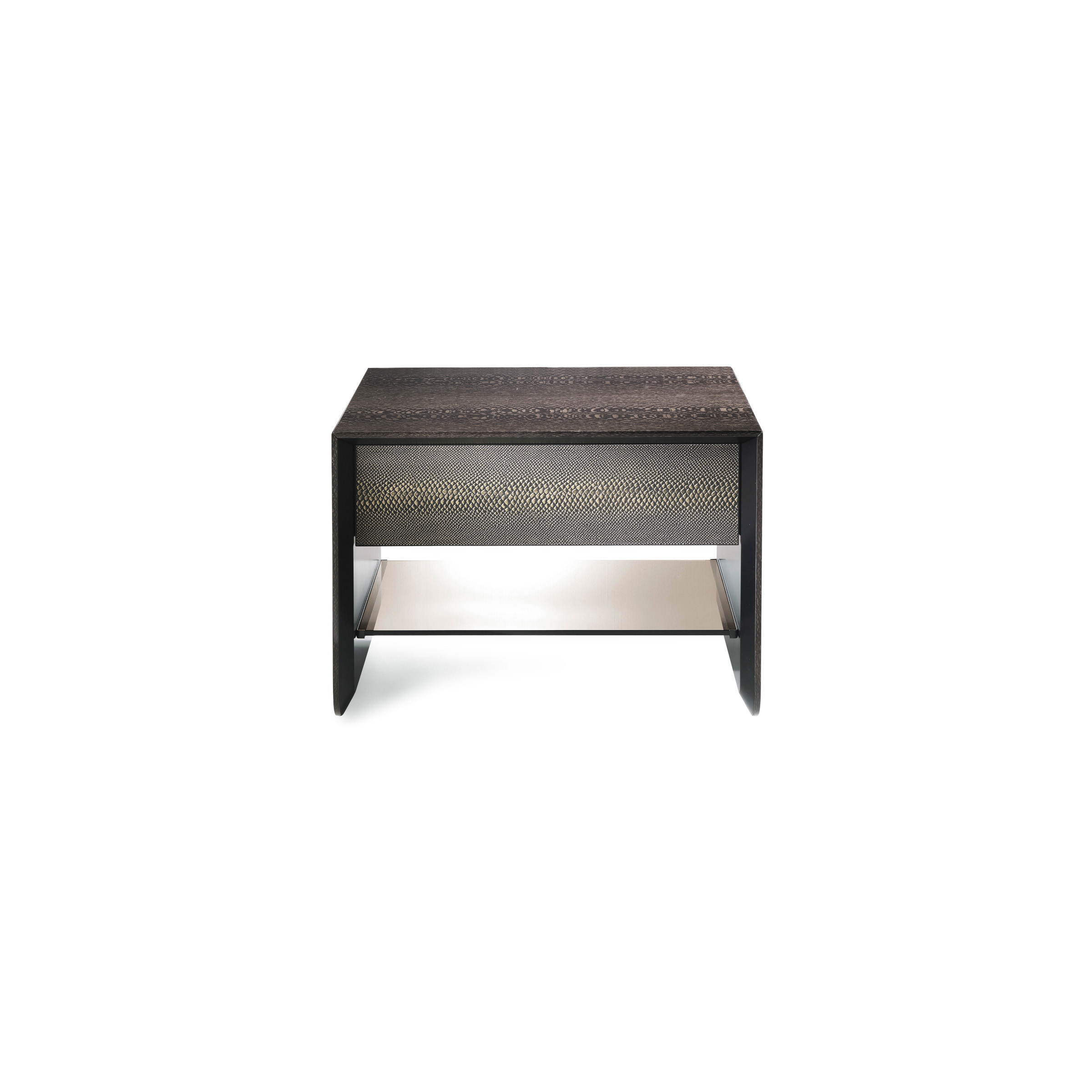 The perfect complement for a bedroom with a rock and gritty style, the Morne night table combines wood with python textures and antique bronze finishing.