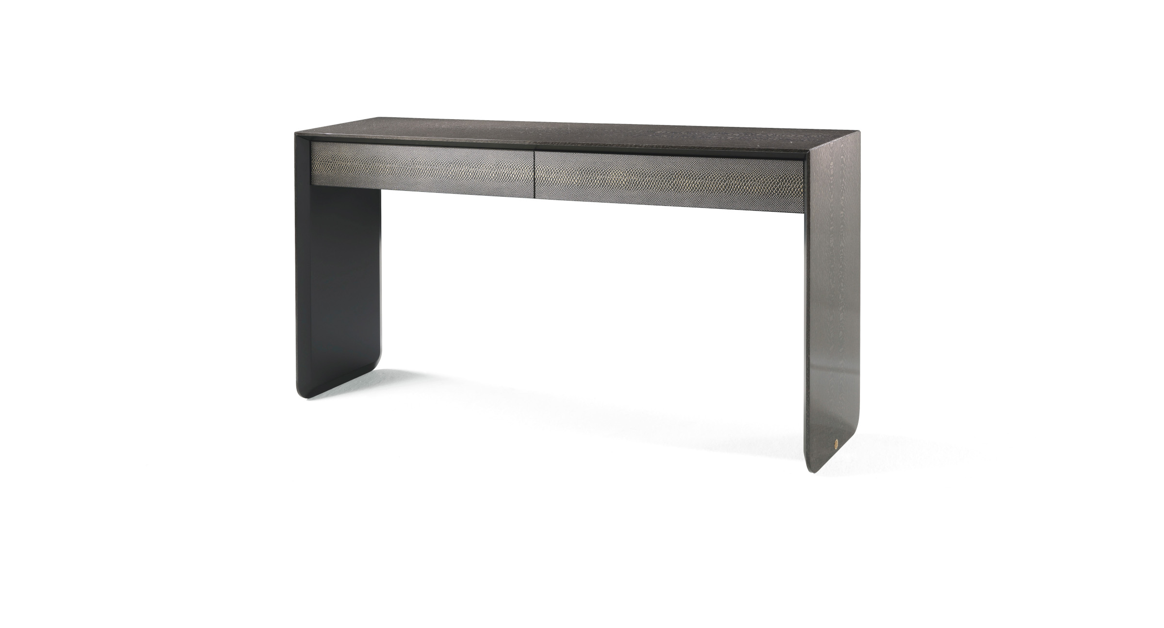 Precisely crafted, the Morne console combines precious wood essences with python-textured accents and hints of antique bronze. The distinctive brass plate with the Roberto Cavalli monogram adds a touch of sophistication for a space that blends elegance and meticulous craftsmanship.