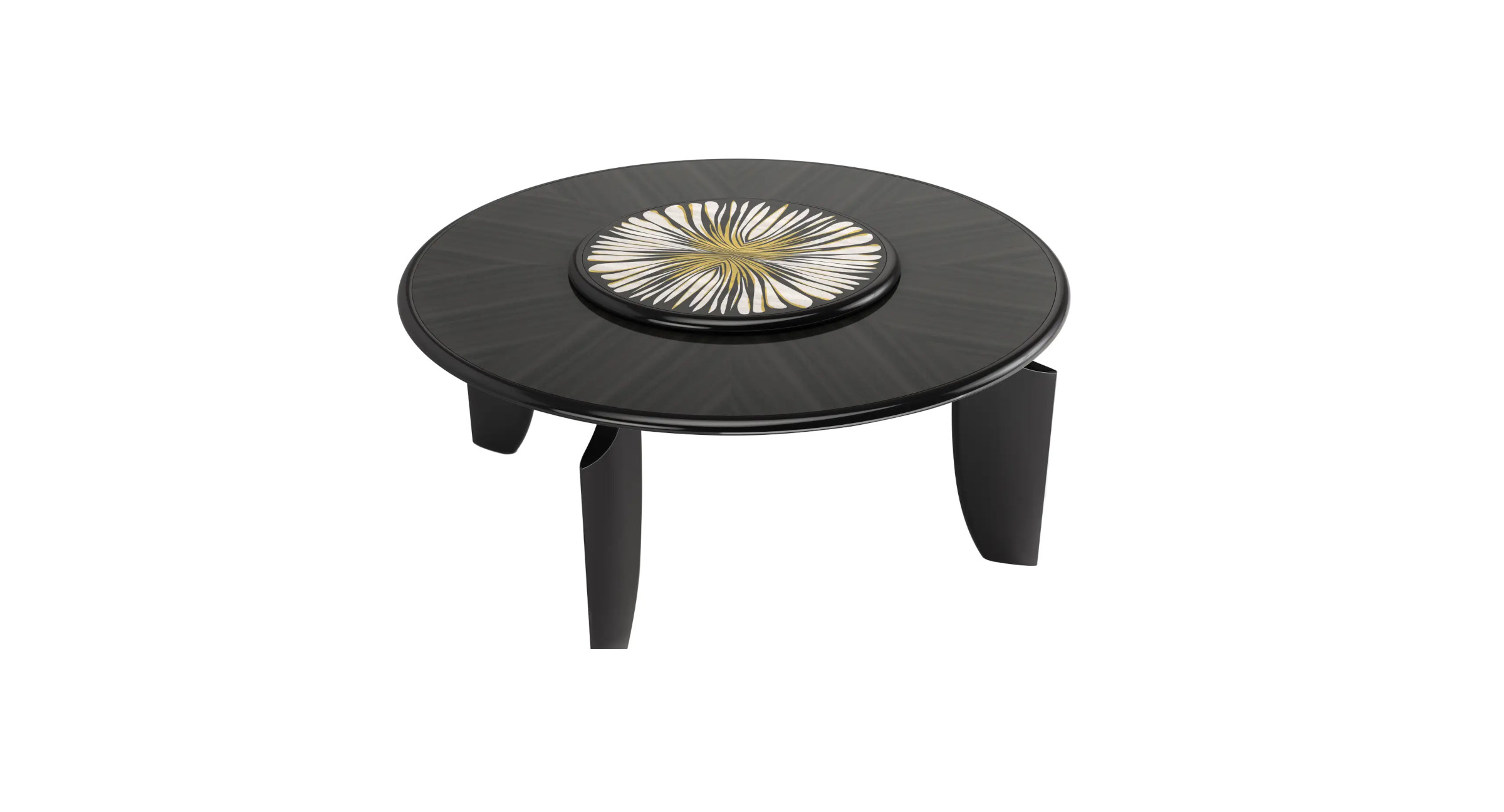 Part of a capsule collection dedicated to the iconic Ray of Gold print, the large rectangular table features rounded corners with soft lines and curved legs in solid black beech that reproduce, in geometric form, the winged sleeves of the first dress made with the print in 2007. Its bold scenic presence is emphasised by the table top, with a decorative motif created through an inlay technique using three different types of wood. An artefact born of the craftsmanship that has always distinguished Roberto Cavalli Home Interiors. The result is a sculptural element that links the elaboration of design to an artistic value in the pure meaning of contemporary luxury.