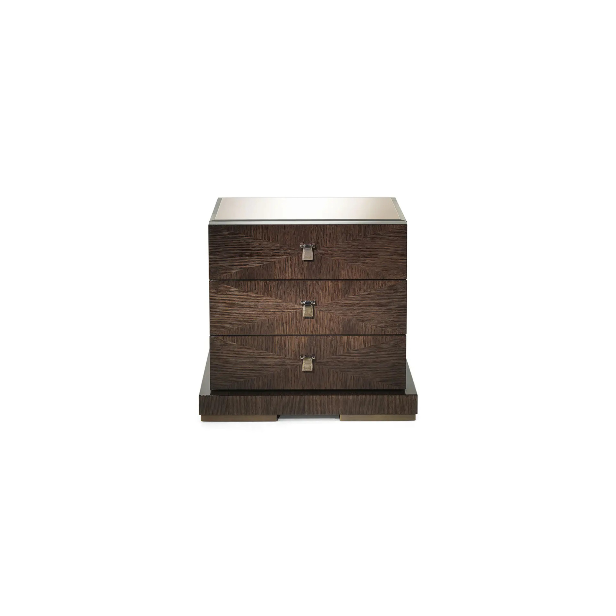 A vintage-inspired line of functional and sophisticated furnishings. The night table features a wood structure, top and sides covered in mirror and jewel handles in cast brass. A brass plate with the iconic Roberto Cavalli monogram adds a touch of timeless elegance.