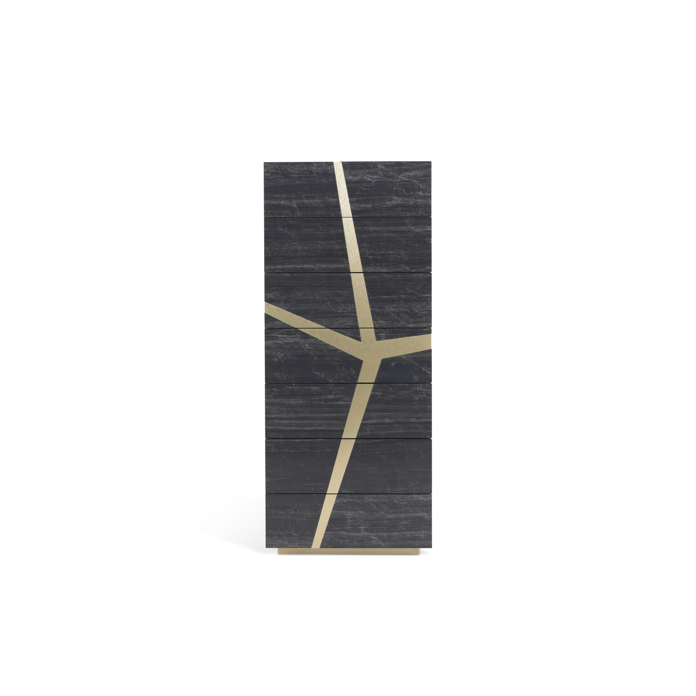 Tonga is a chest of drawers with contemporary lines and a vertical shape that combines functionality and aesthetic value. The piece is the result of a complex process of porcelain stoneware craftsmanship, enriched with metal inserts whose design recalls the giraffe pattern.