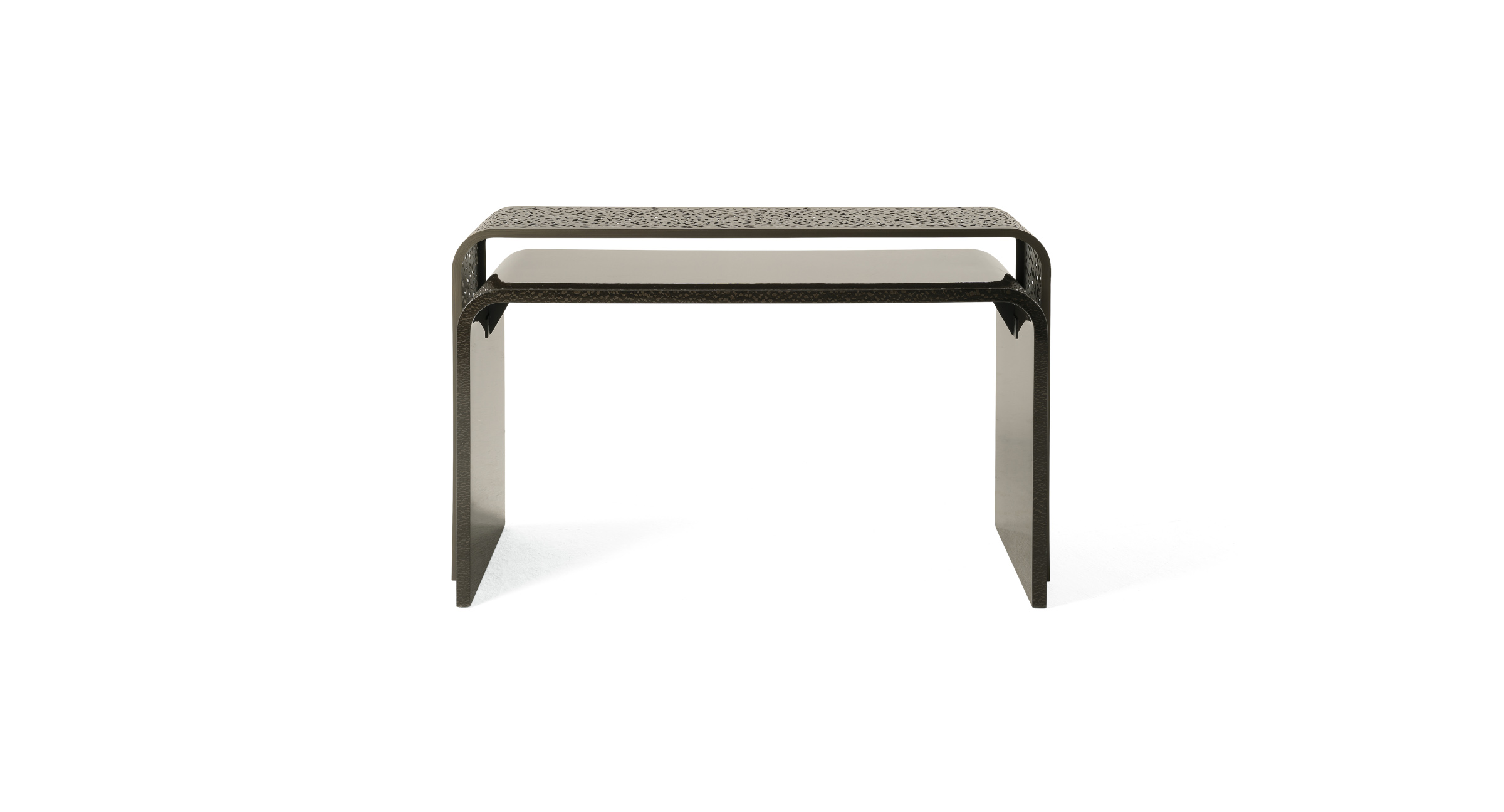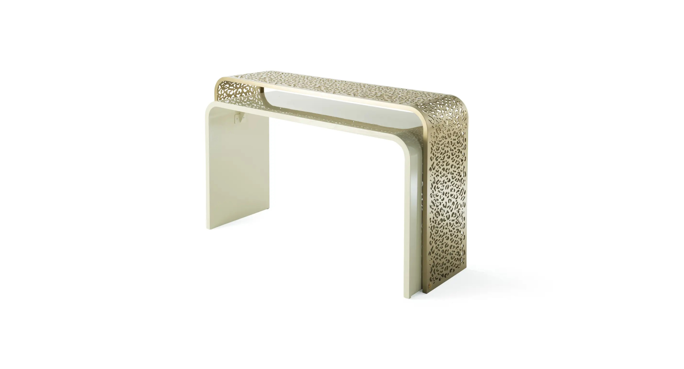 Watamu is an original set of two consoles with an evocative name, that pays homage to the well-known Kenyan location. The essential and minimalist lines of the composition are enriched by the exuberant and sophisticated decorativism typical of Roberto Cavalli Home Interiors brand: one of the two elements is in animalier laser-cut metal, while the other is in precious wood of the collection.