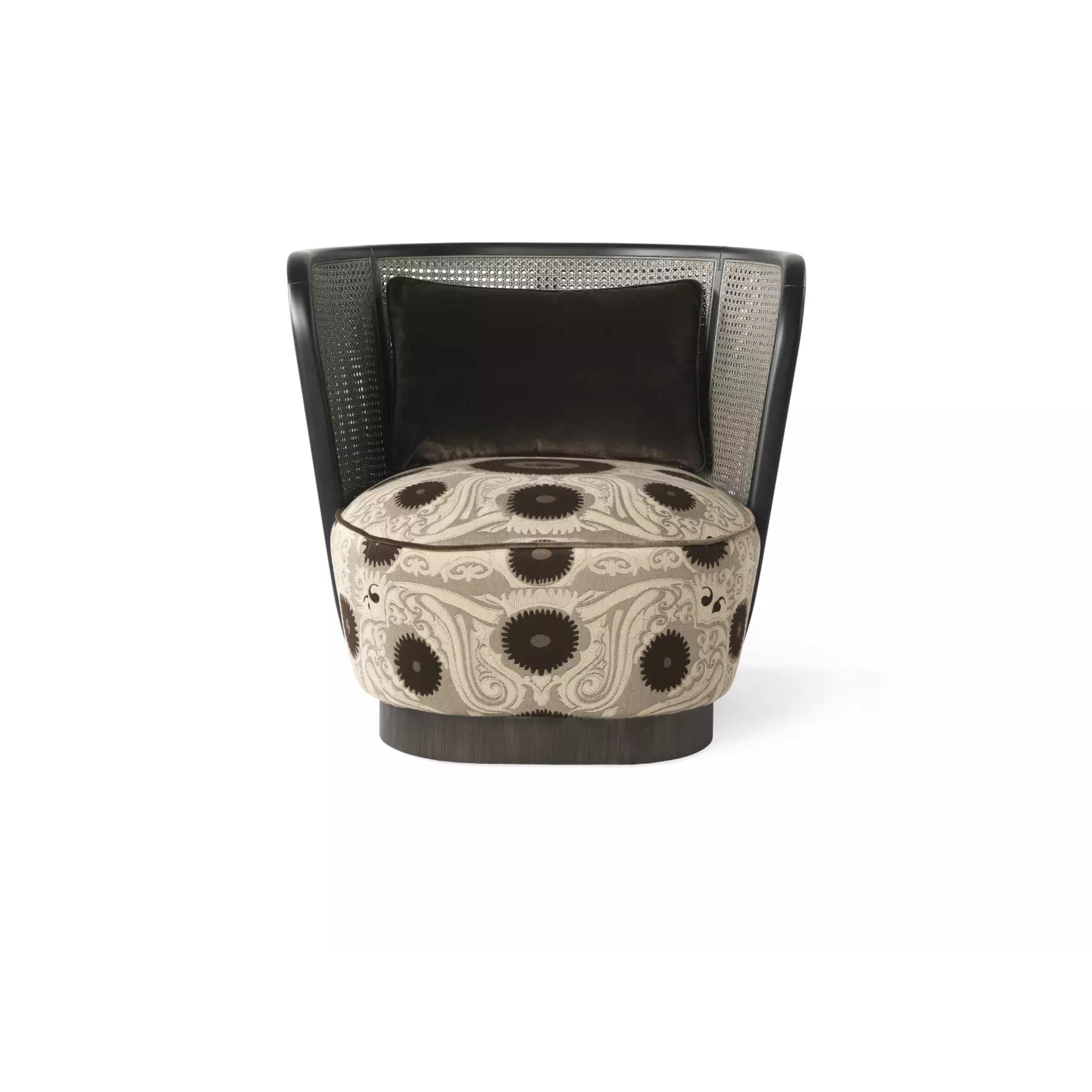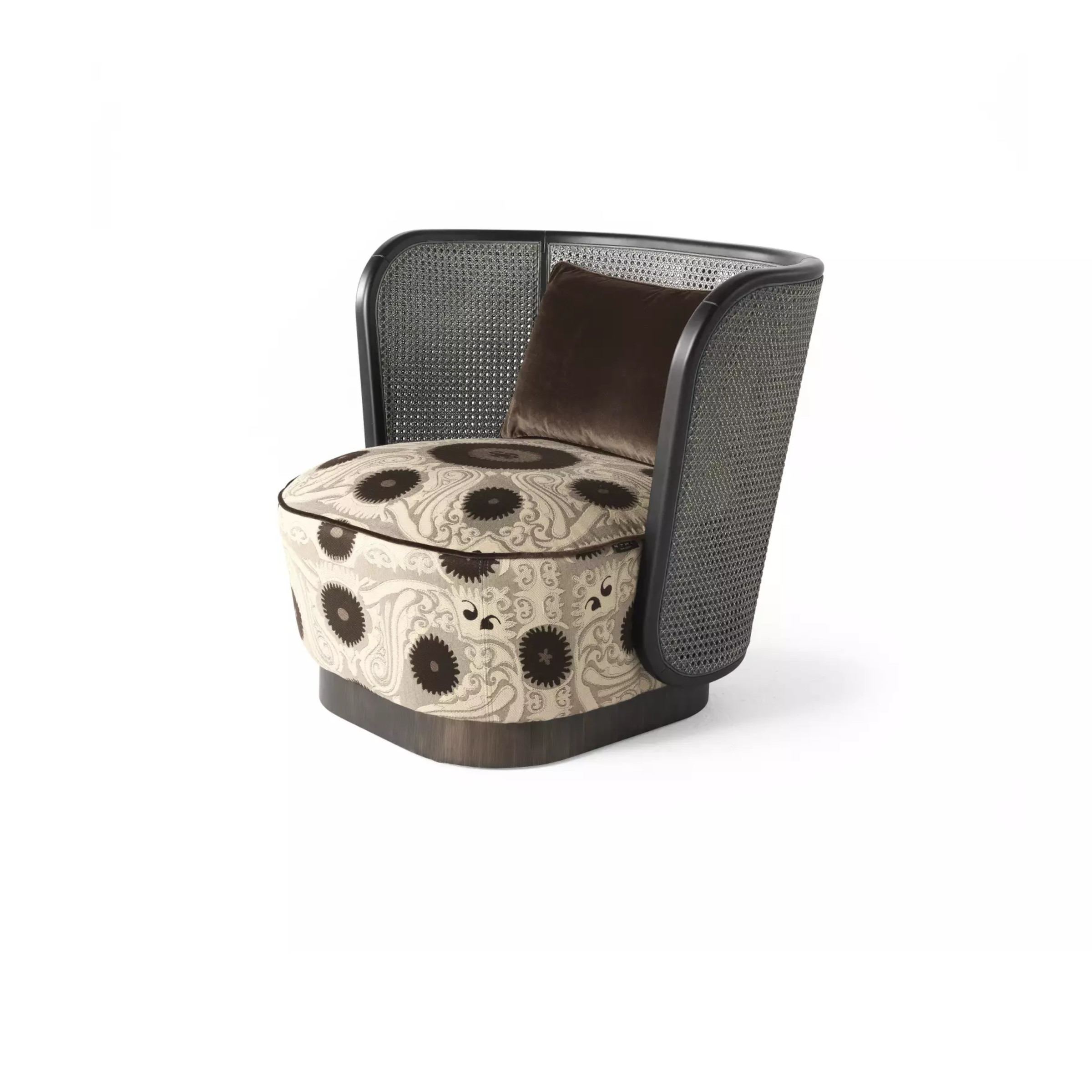 An armchair with soft and enveloping lines, whose low and comfortable seat recalls the exoticism of a traditional ottoman. The upholstery in jacquard fabric Bukhara with Suzani pattern creates a harmonious contrast with the lightness of the fan-shaped caned backrest.