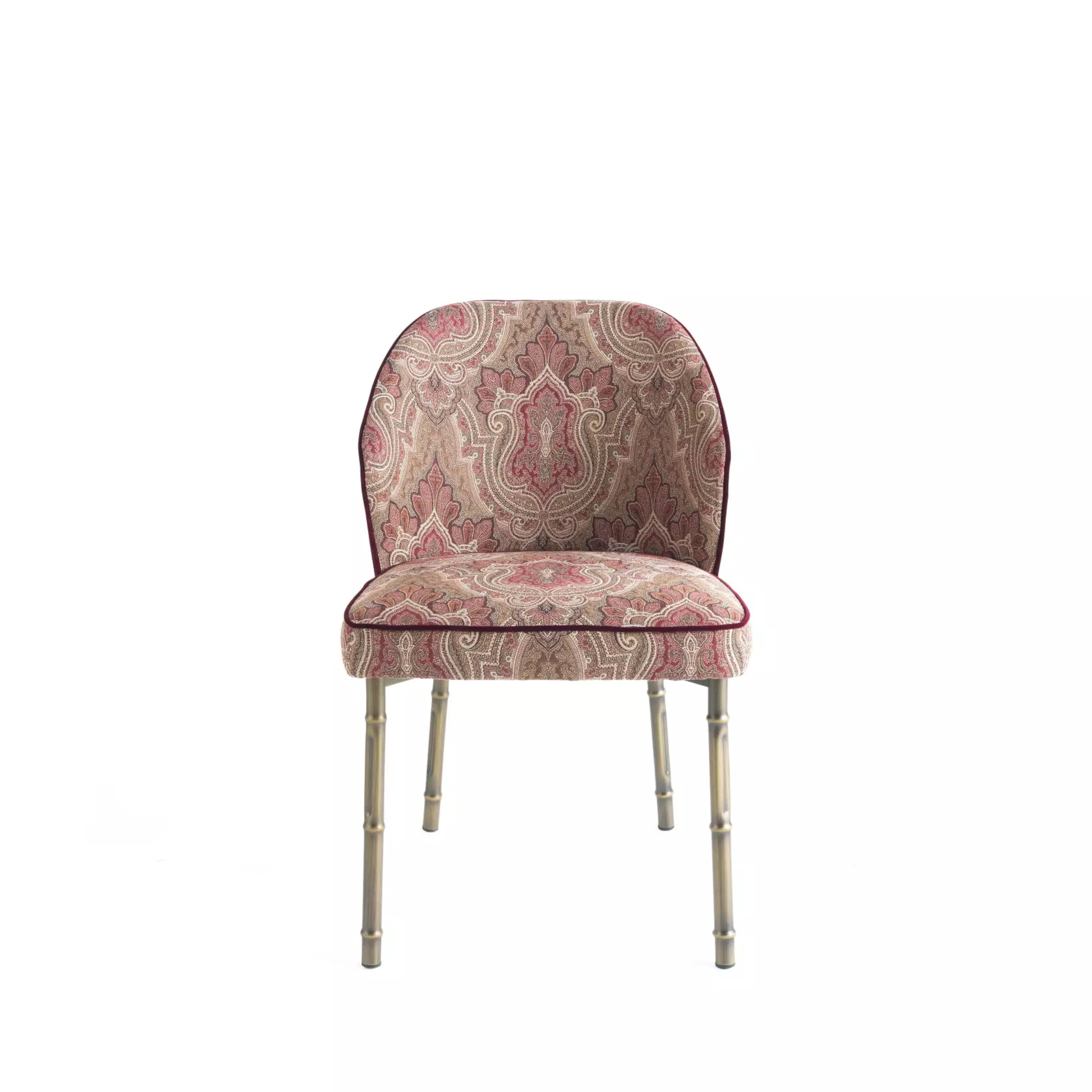 In the Frida chair the richness of the fabrics, with their meaningful and evocative colors enhanced by the contrasting piping, meets the suggestions of Asian nature, evoked by the metal legs with bamboo shape. The precious monkey applied to the back is an exotic decorative element that characterizes the Maison’s collections.