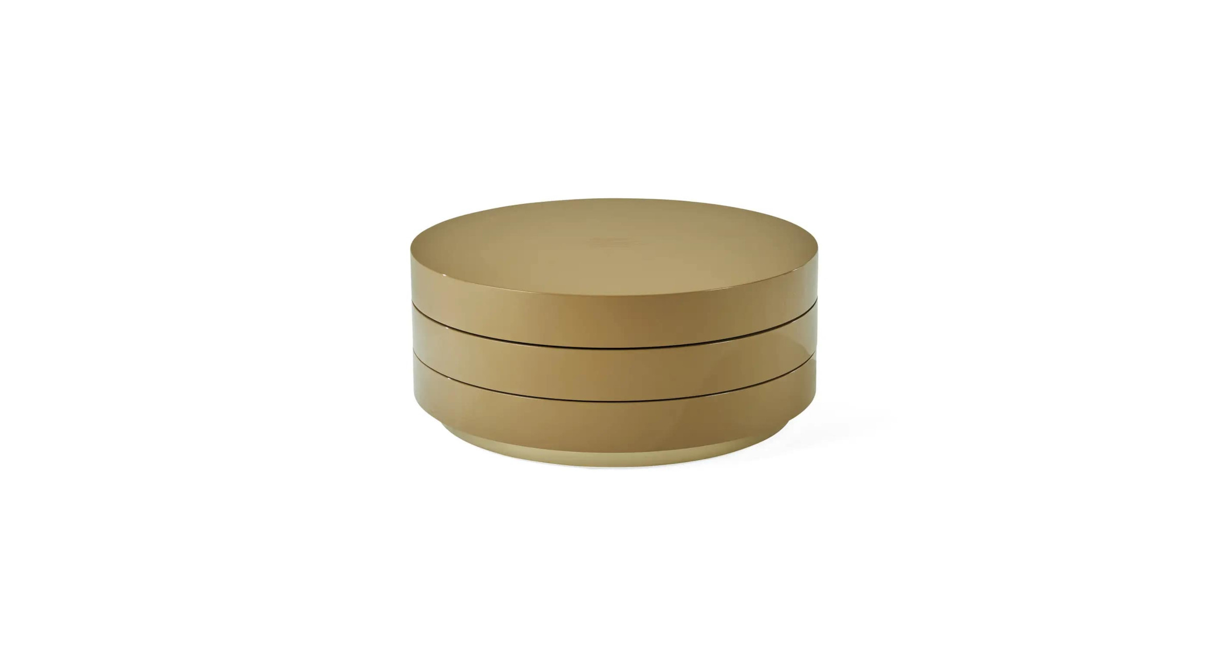 Tiered is an original small table with a circular shape that conceals two swivel drawers. Finished in the new lacquers of the collection and with a microfibre interior, this piece of furniture stands out for its refined appeal and vintage accents.