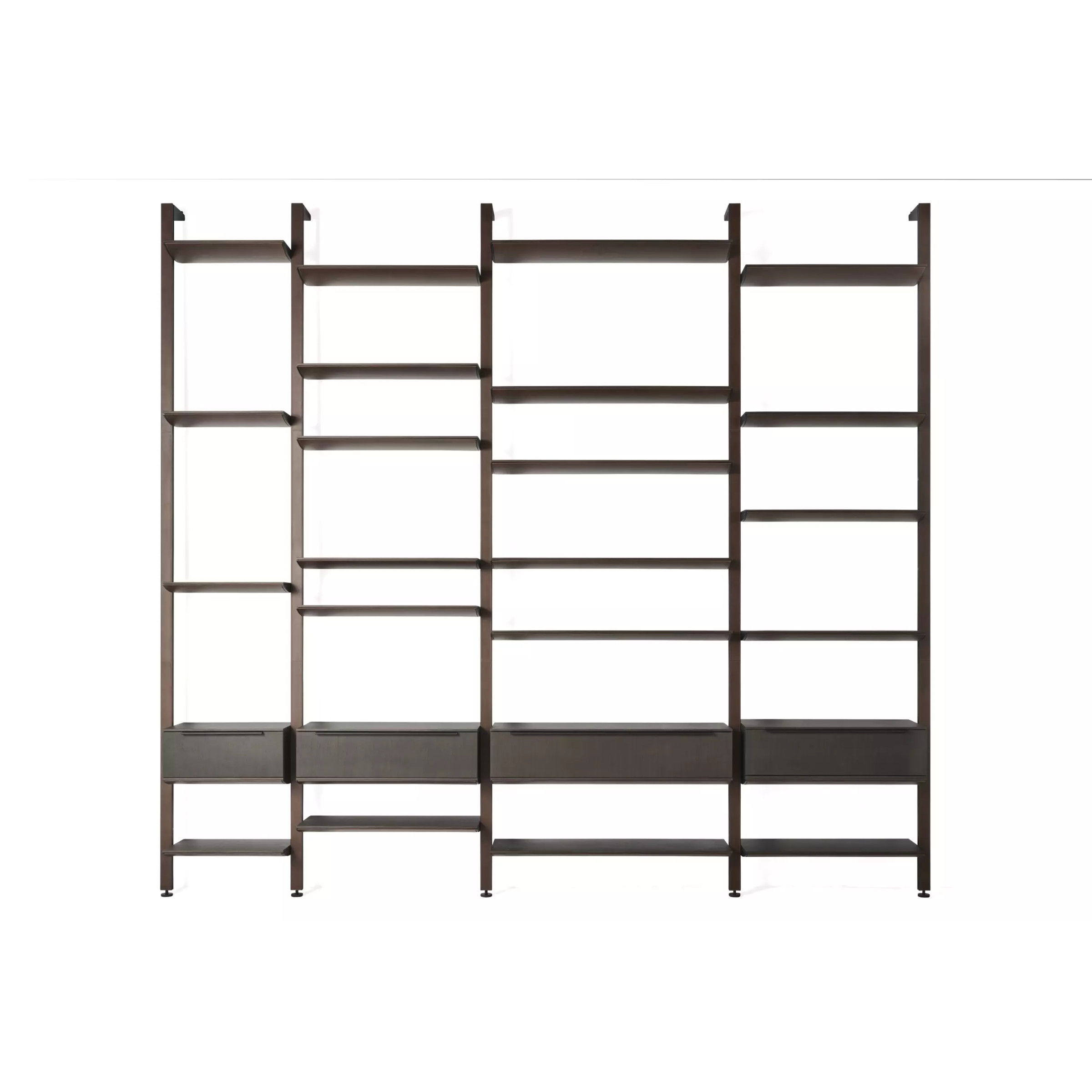 With its sculptural charm and contemporary appeal, the new Hackney bookcase is designed to furnish the walls in a functional and striking way. Customisable within the composition, the bookcase is made of Tay wood with metal finishes and presents leather-covered shelves and pillars that bestow it with a note of luxury.