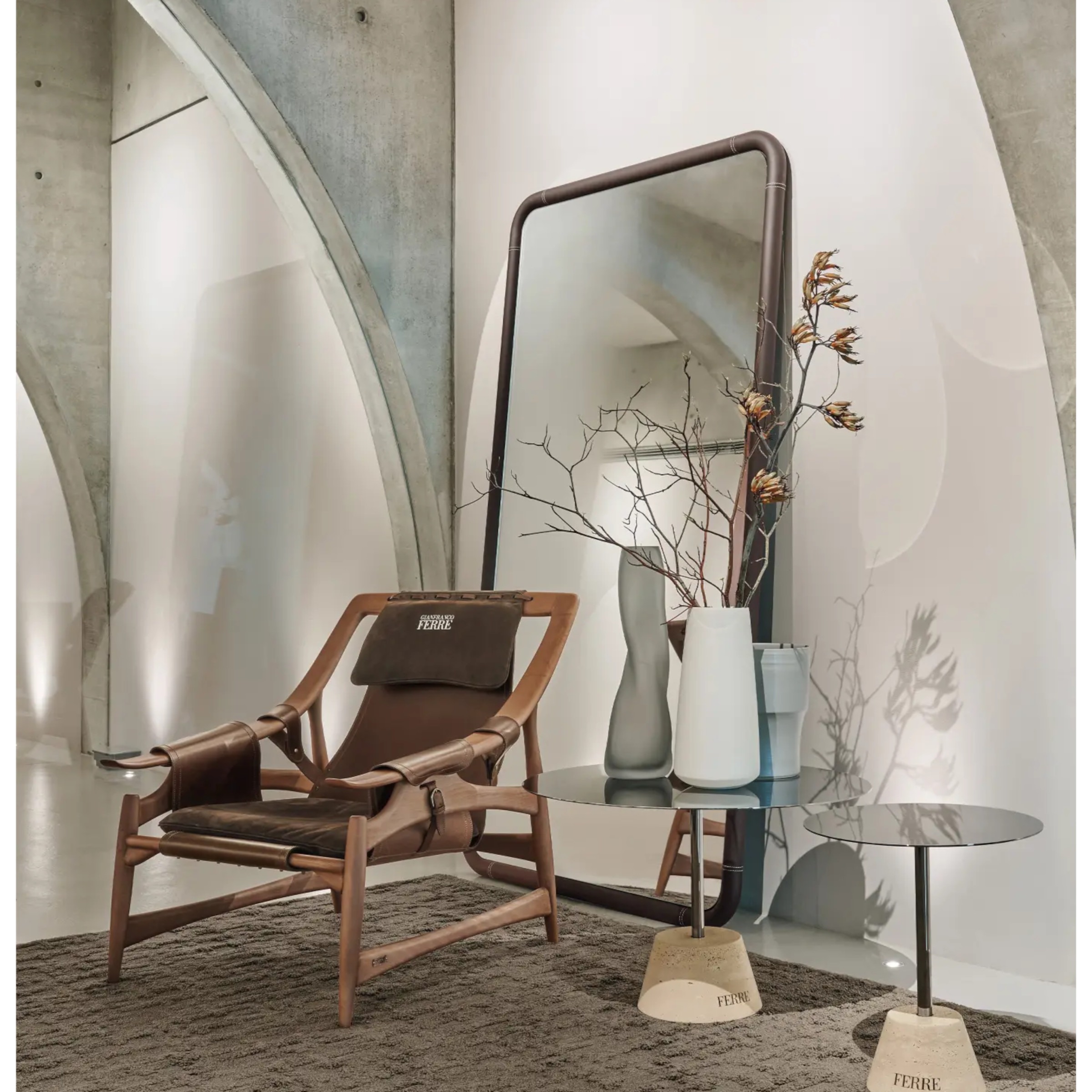 Pure essence and bold character define Inari large mirror, seamlessly blending a sleek design with luxurious details. The leather frame elegantly embraces the mirror, infusing any space with a touch of sophisticated modernity.