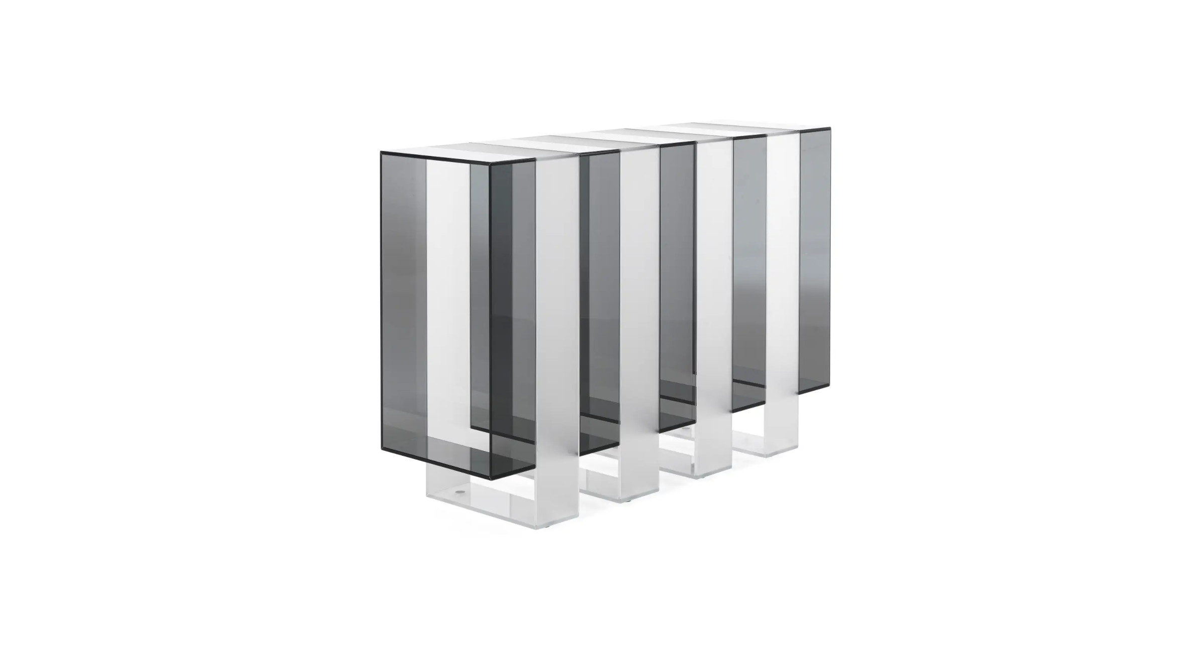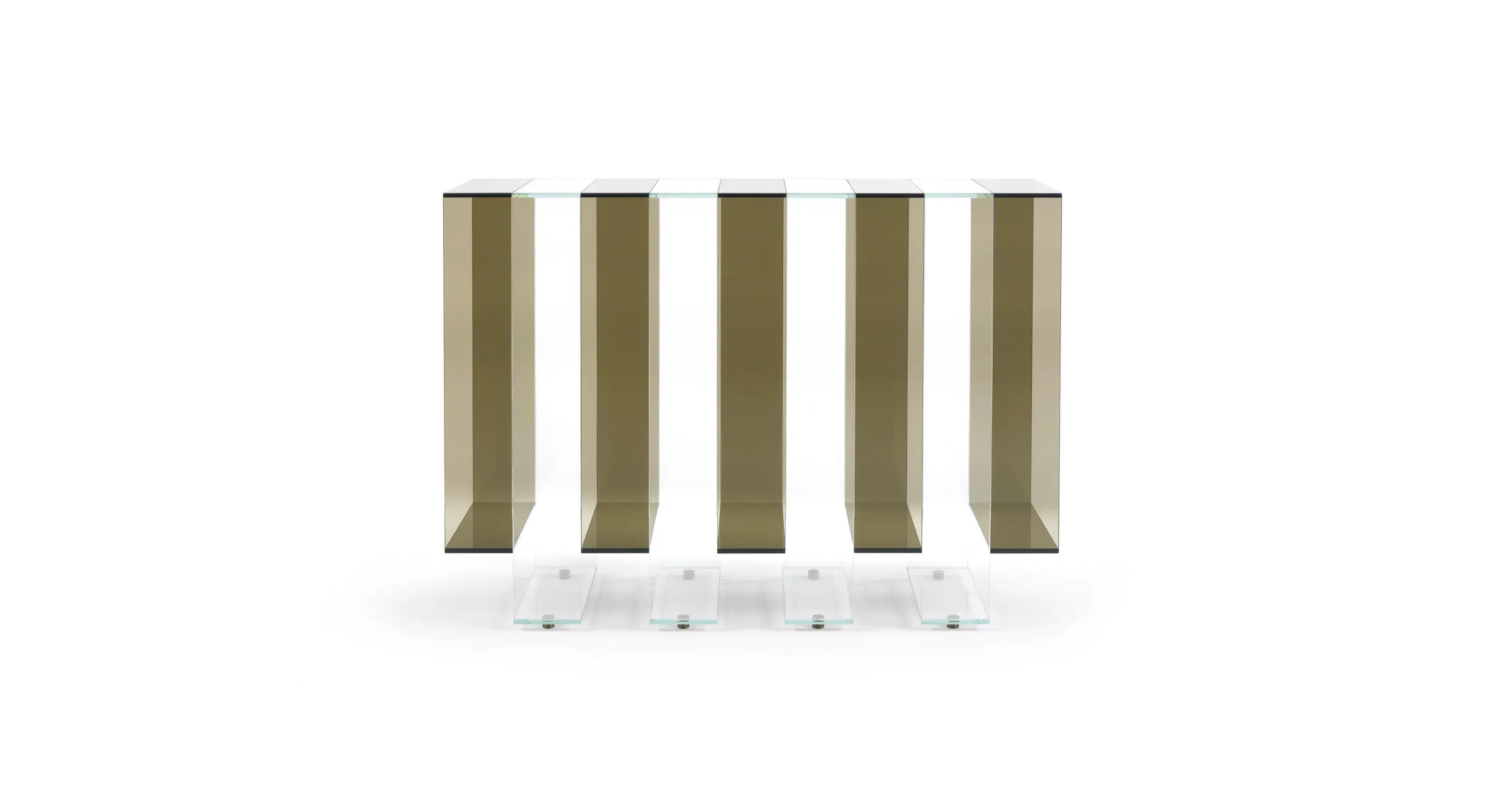 Pure volumes and essential lines: these are the main features of the Jenga console. A composition with a refined design that is expressed in the succession of light and dark glass rectangles, assembled at 45° and joined without showing grafts or joints. The entire structure is made of glass and the whole piece is revealed to the eye as a unique light and refined block.
