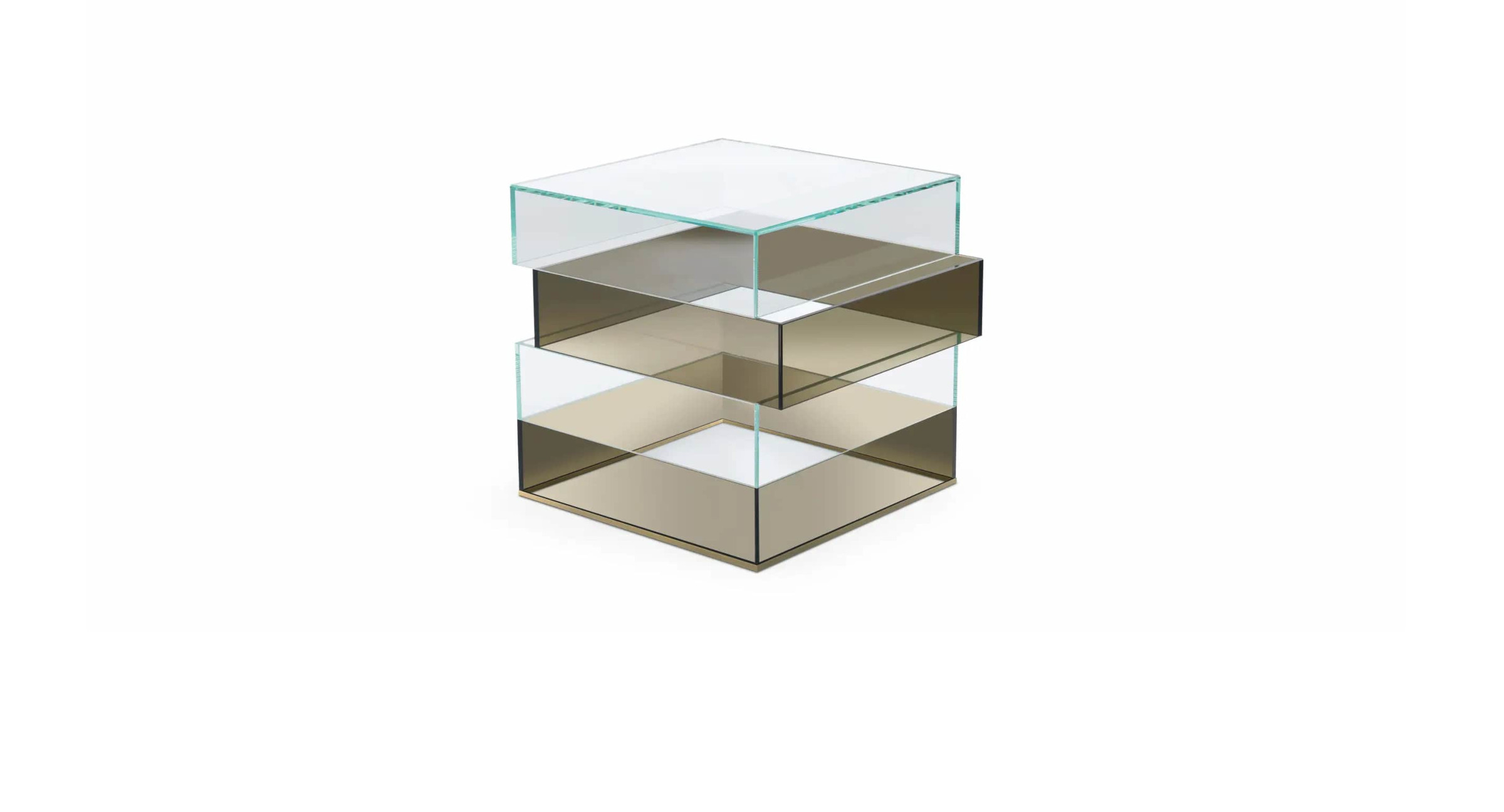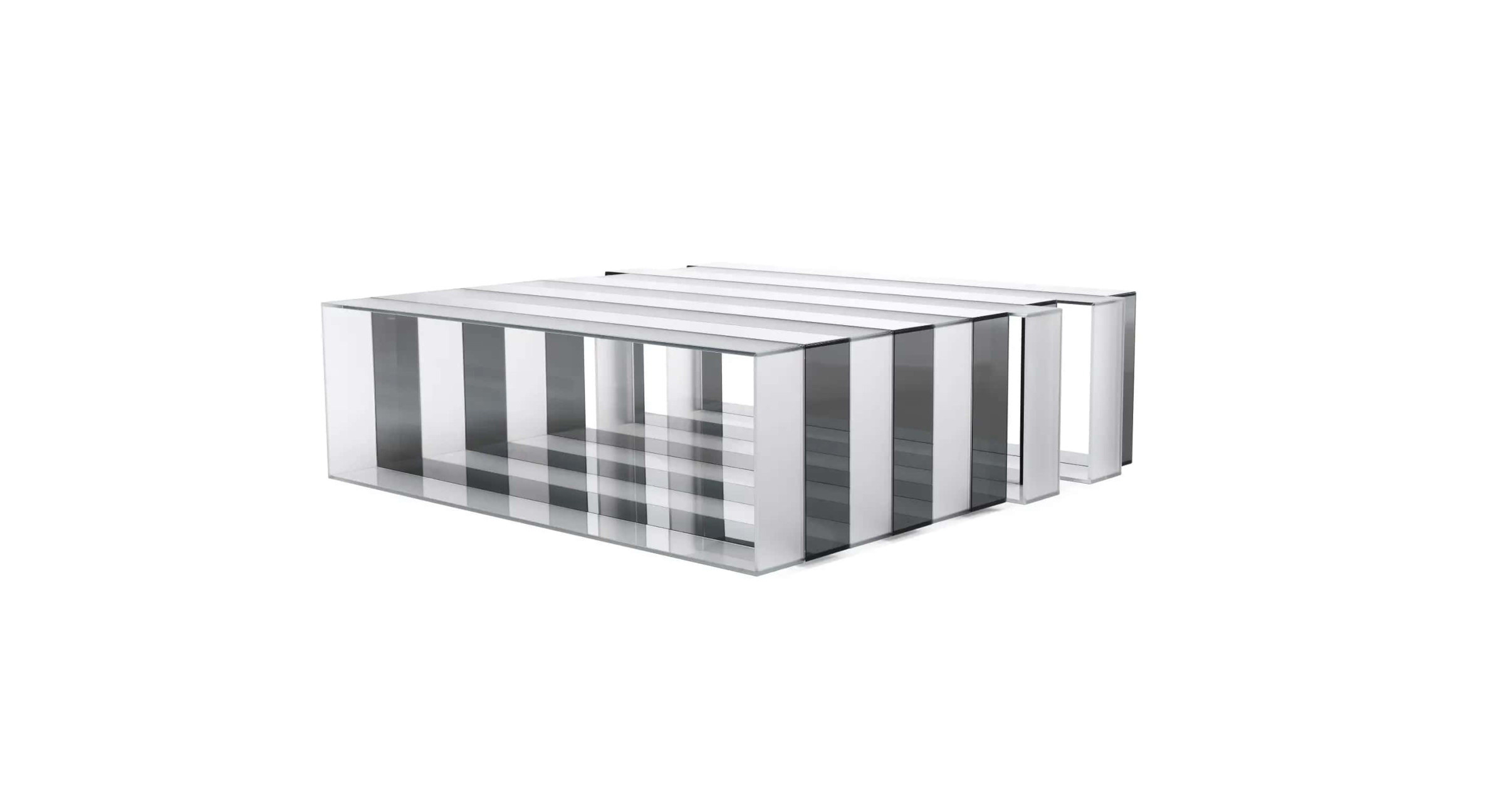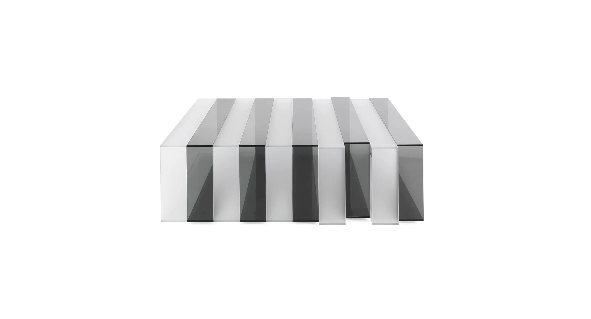 Pure volumes and essential lines: these are the main features of the Jenga low table. A composition with a refined design that is expressed in the succession of light and dark glass rectangles, assembled at 45° and joined without showing grafts or joints. The entire structure is made of glass and the whole piece is revealed to the eye as a unique light and refined block.