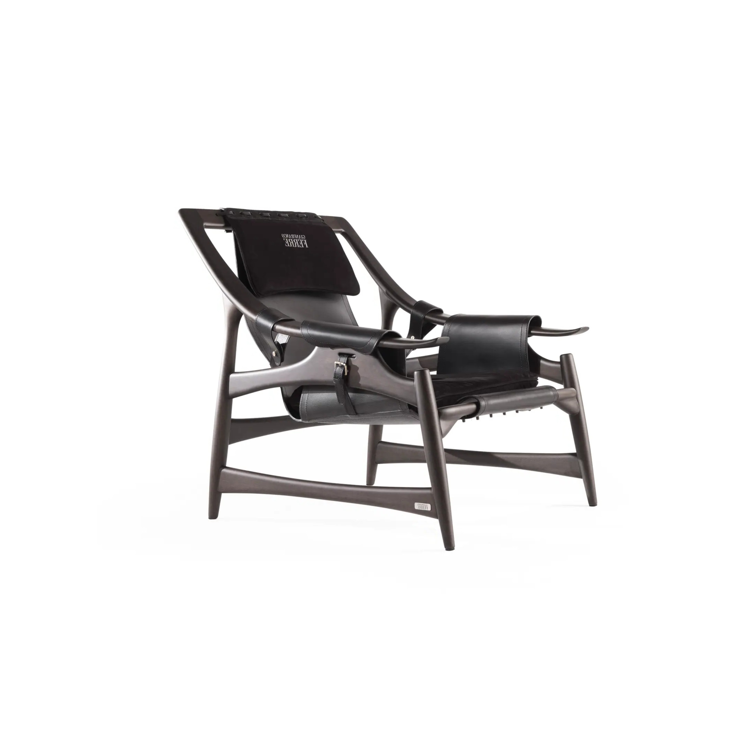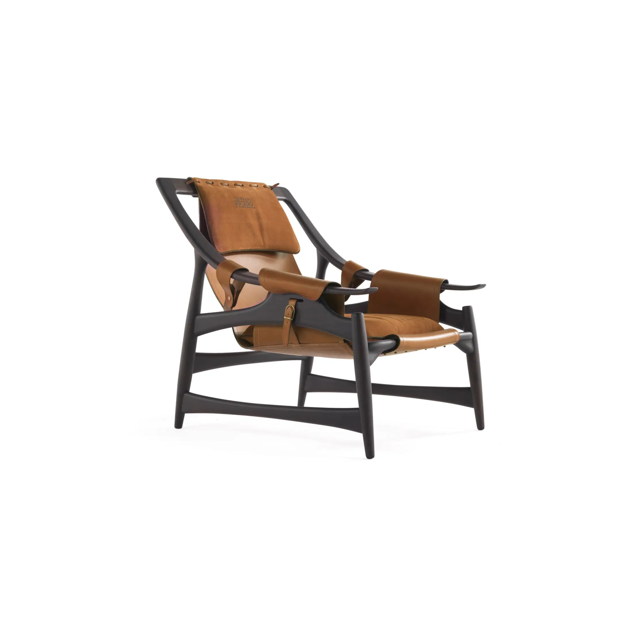 Retro style and metropolitan spirit for the Kalamaja armchair. The solid structure in solid gray tinted stained beech meets the lightness of the suspended leather seat, supported by the armrests with characteristic straps. A furnishing element in typical Mid-century style that fits perfectly into urban decor environments.