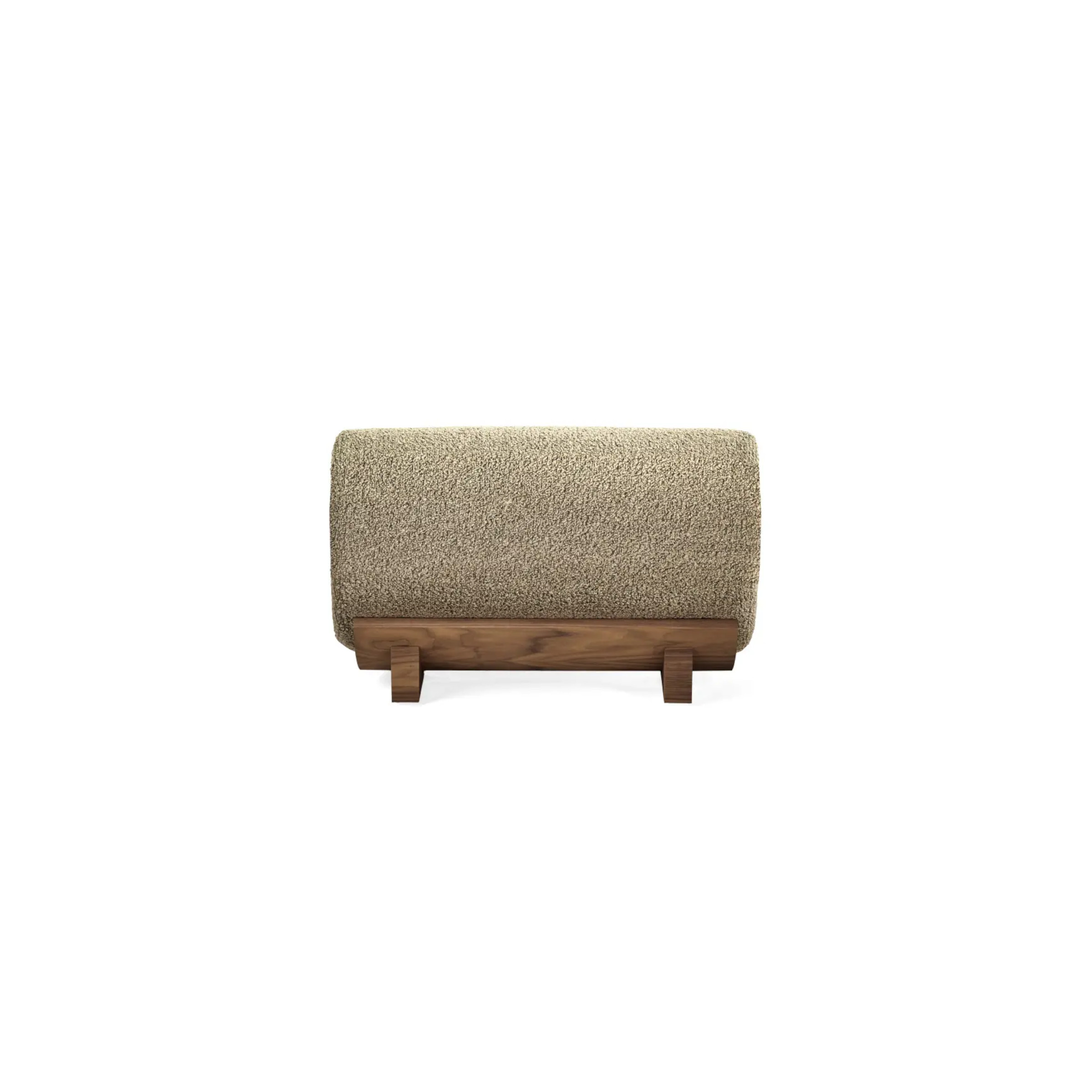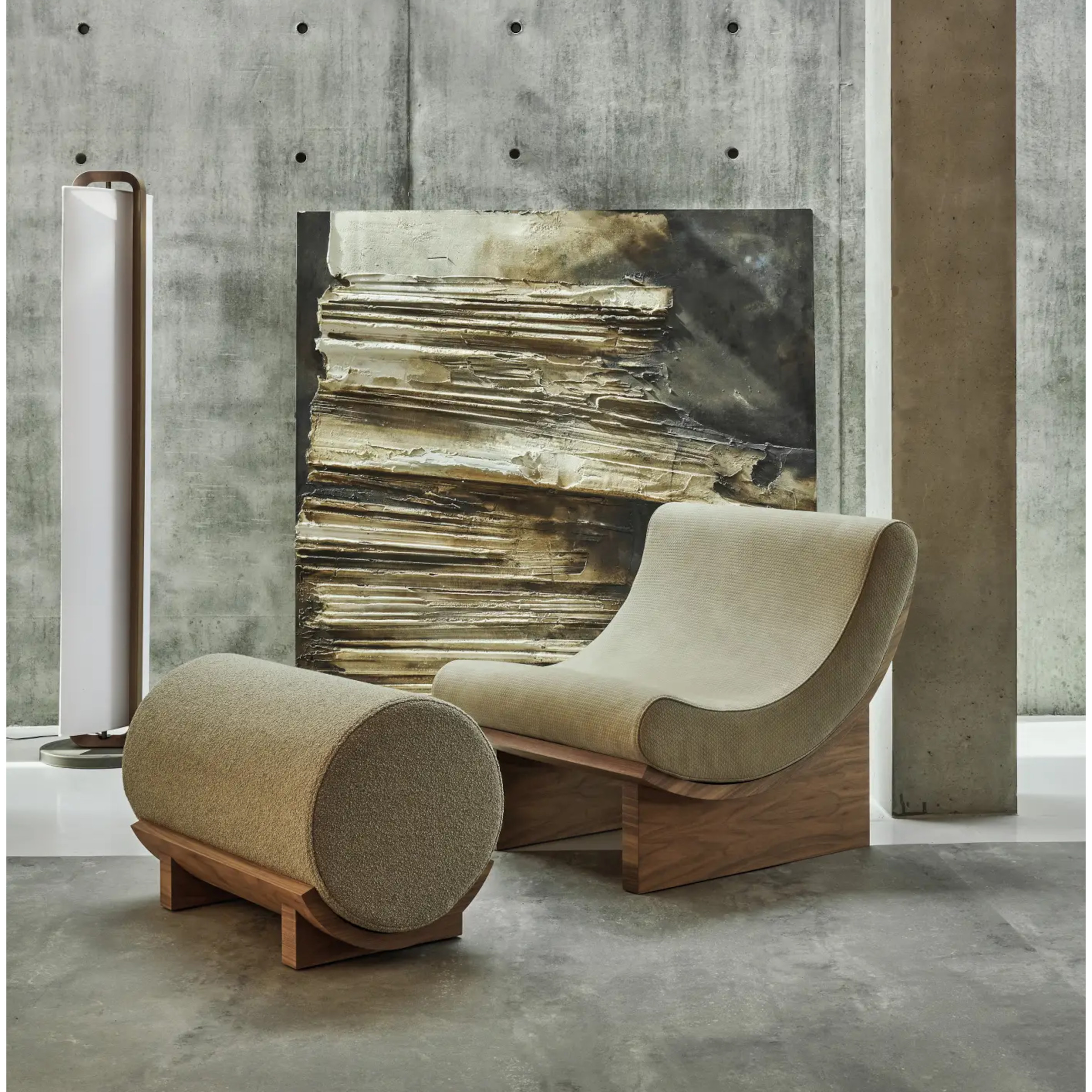 A Japandi-style pouf, perfect for complementing the relaxation area alongside the armchair from the same line or for adding a functional and aesthetic touch to the living room or bedroom. Characterized by a Canaletto walnut structure and a round cushion upholstered in fabrics and leathers from the collection, the Maki pouf represents an original invitation to well-being.
