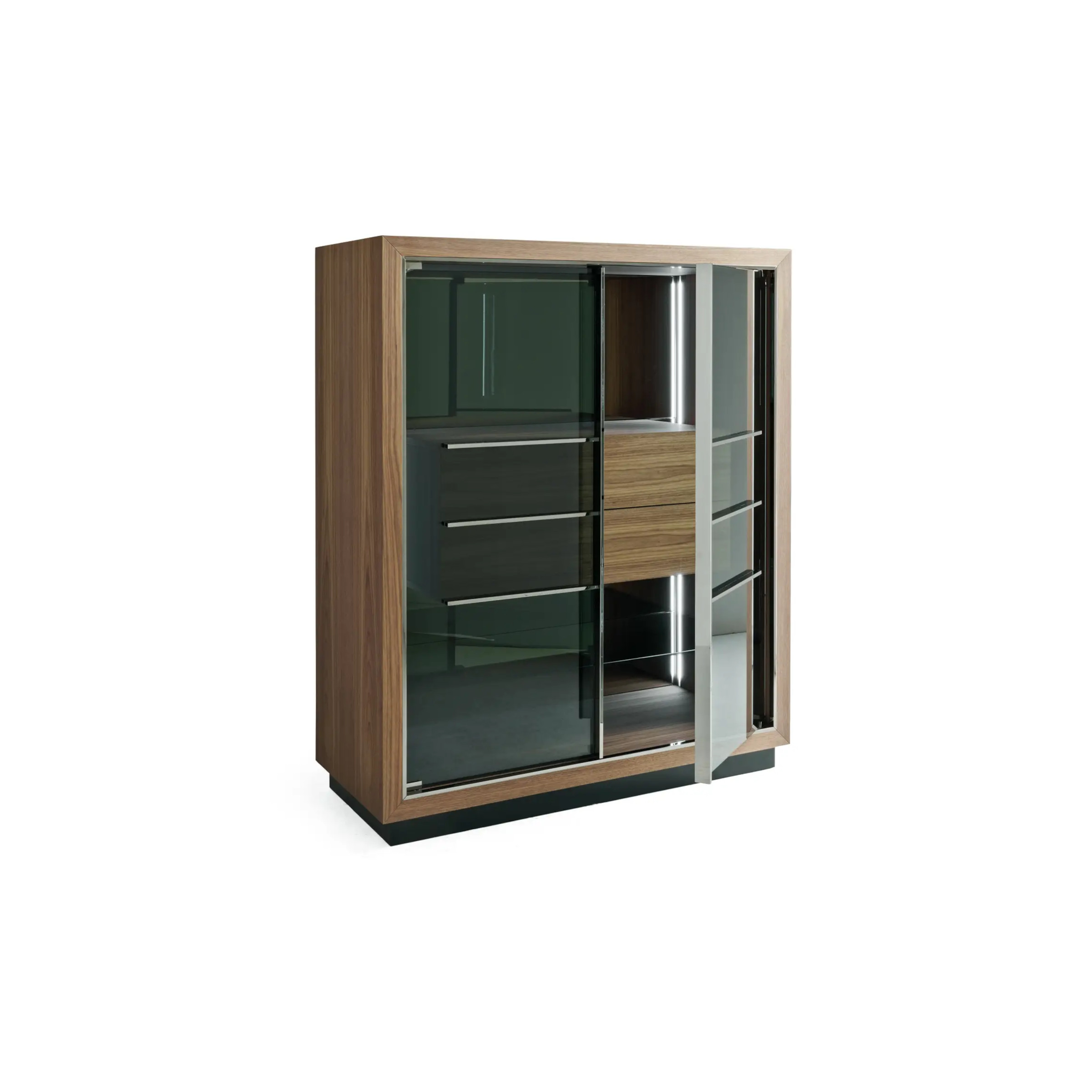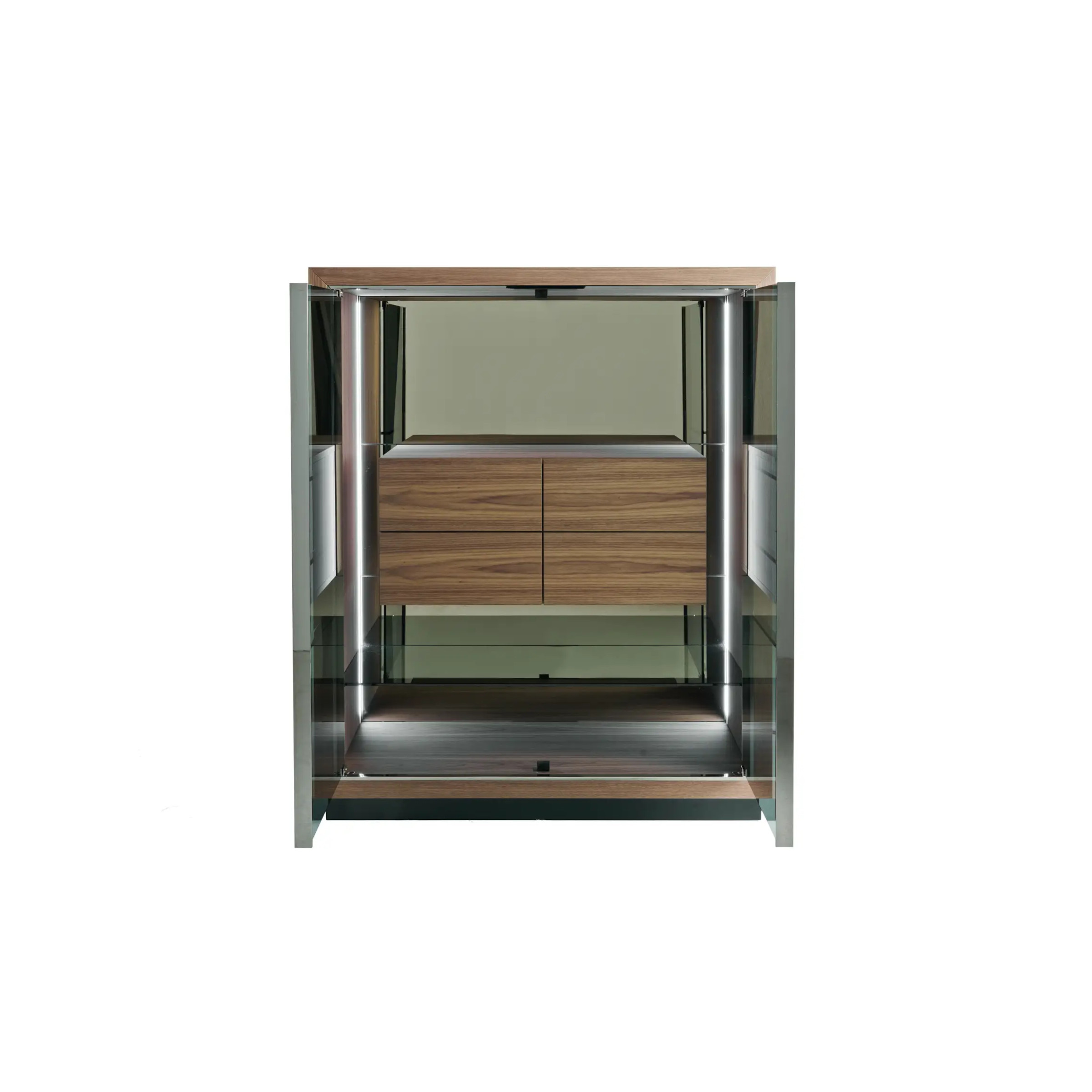 The cabinet completes the New Orleans line by combining aesthetics and functionality. Characterized by a back available in different and luxurious materials and doors in tempered glass, it is equipped with a technology that allows the LED inserted in the showcase to be switched on simply by approaching the base, allowing an intimate and refined lighting.