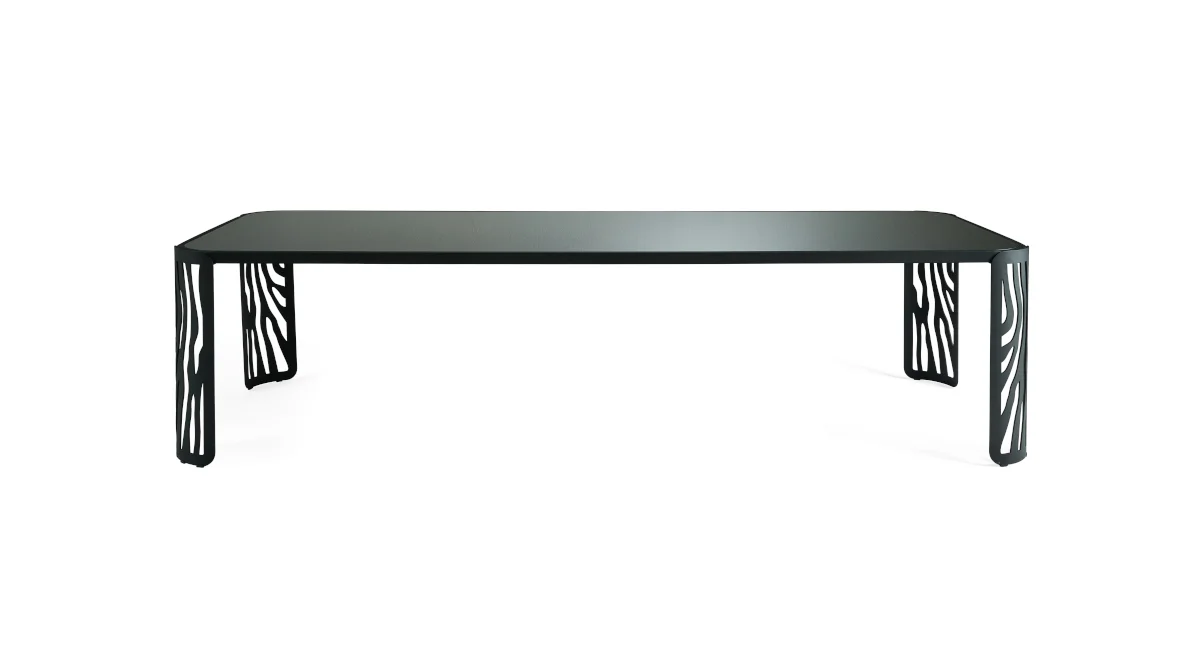 Natural inspiration and African references for a sculptural table such as Kalahari. The base of this decorative piece of furniture is made of calendered iron with a laser-cut pattern that recalls both the iconic animal motifs and the desert dunes evoked by its name. The top lends an elegant and light touch to the whole.