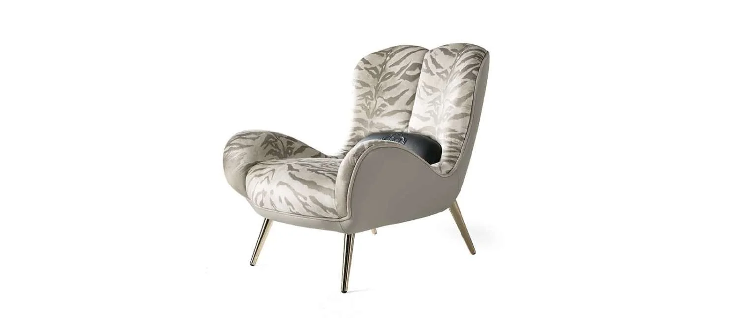 Soft shapes and exotic suggestions for the Tifnit armchair. The upholstery, with the typical fabrics featuring iconic animal patterns, lends the piece of furniture a wild and sensual spirit. The external structure upholstered in leather lends a gritty allure to the whole, while the glossy gold feet give a bright, luxurious and glamorous accent.