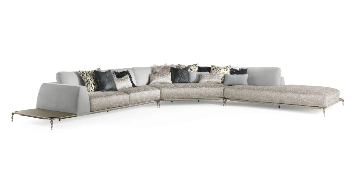 Viktoria is a sofa with elegant lines that elevates the living space with opulent comfort. It stands on cast brass feet with gold finishing, adding a touch of glamour. The metal shelves contribute to the overall elegance, making the sofa a statement of refined taste and sophistication.