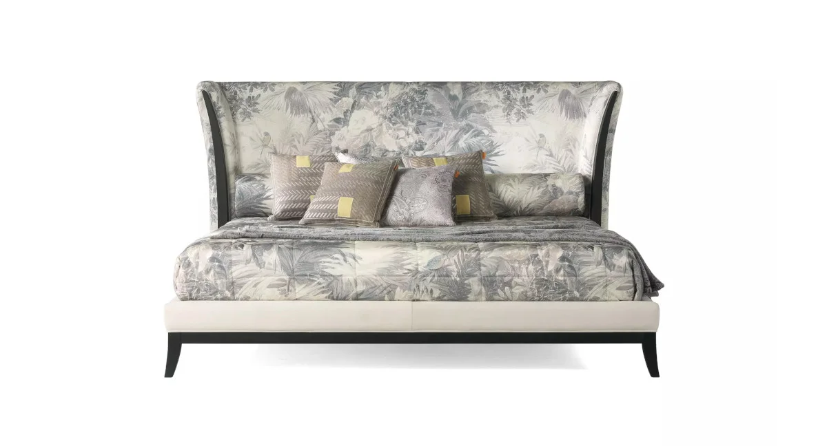 Ceylon is an evocative bed that recalls exotic atmospheres and remote lands. The curved outwards headboard reminds of the furnishings of the colonial tradition and is upholstered with emblematic fabrics of the collection. The contrasting base in wood underlines and enhances the seductive lines of the bed, enriched by two roll cushions with the same upholstery. The Ceylon line also includes sofa, armchair and pouf.