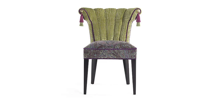 In this original chair, the brand's sophistication and innovative spirit are played with in a fun and extravagant way. The classic lines of the piece meet the irony of the colourful tassels, while the combination of different patterns and fabrics creates a lively and eclectic ensemble.