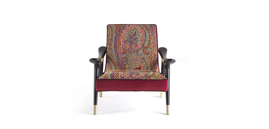 Emblematic of the ethnic mood of Etro Home Interiors, the Masai armchair is a tribute to Africa: the reference to the African continent can be found in its shape and in the detail of the metal rings. Scenic and evocative, the armchair is available in various iconic fabrics.
