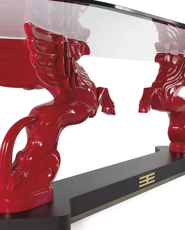Mythology meets design in Mythos dining table, a scenographic piece of furniture whose main protagonist is the most famous among the winged horses, Pegasus, the heraldic figure symbol of the Etro brand. Facing each other in a dynamic position and resting on a base that recalls the shape of an arrow, the two mythological animals support the glass top through the play of their wings, visible through the transparency. The brass details, of the symbol that recalls the initial letter of the Etro brand, illuminate the whole giving the table an eclectic charm.
