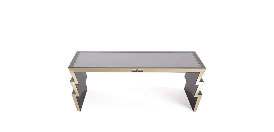 Made in smoked frisé eucalyptus wood, the Ziggy central tables set is supported by legs recalling the zigzag shape of the thunderbolts. The mythological inspiration, one of the dominant themes in the 2019 collection, is expressed in this case in an element with a minimalist, essential and scenographic design. A single line with brass profiles, luminous like the lightnings thrown by Zeus in Greek mythology and further embellished by the symbol that recalls the Etro logo.