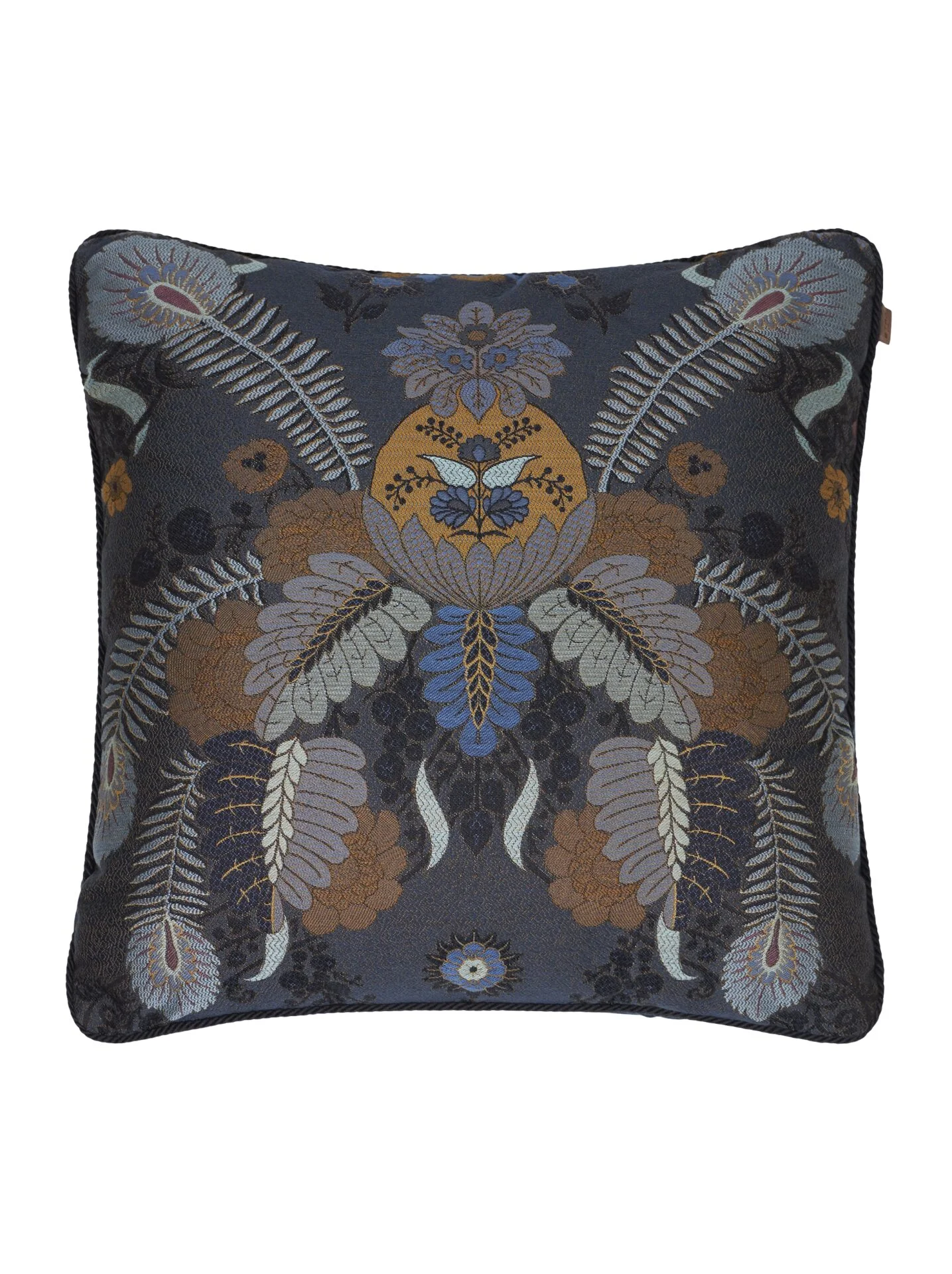Classic jacquard fabric cushion from the furniture collection, with plain-coloured cotton velvet back part. Trimming cord around the outer edge.