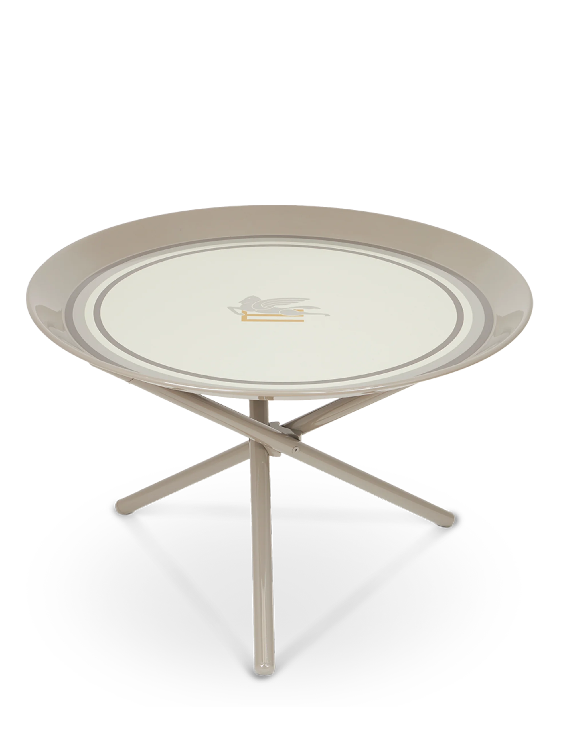 Lacquered rounded metal tray with decorative motif. Can serve as both a tray and small table.