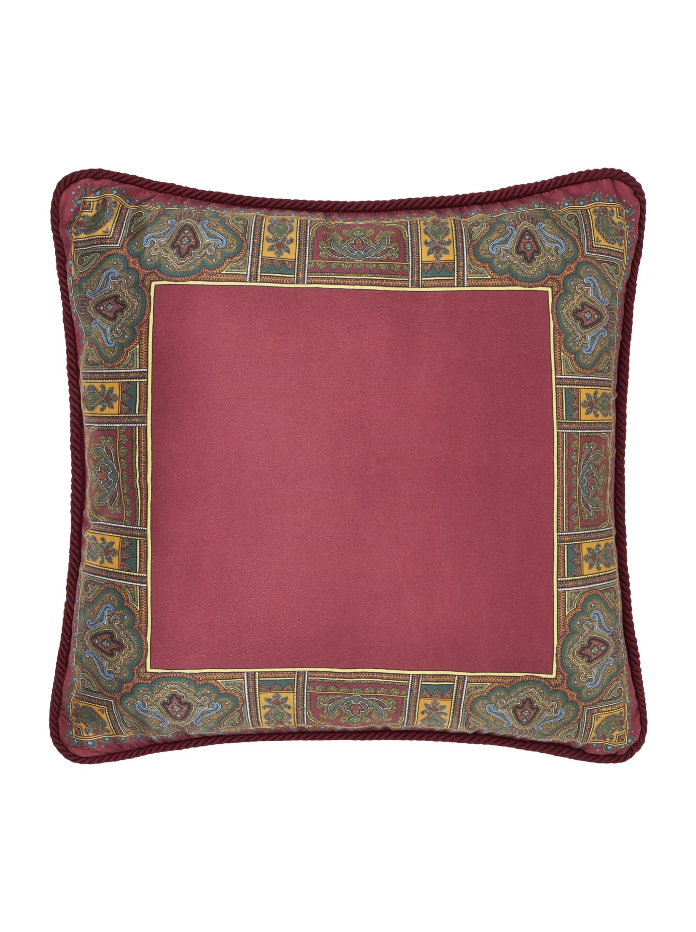 Printed silk cushion with decorative Paisley motif around the edge and plain-coloured cotton velvet back part. Trimming cord around the outer edge.
