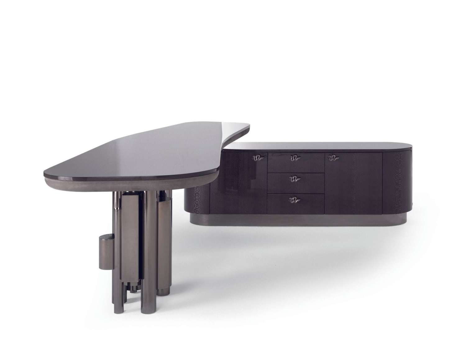 Antigua desk, with its sculptural design and its luxurious charm, is the perfect centerpiece for prestigious working spaces. In this version, it features a top and chest of drawers with a glossy grey Carbalho finishing, black leather upholstery and legs with a golden finishing. The snake handles and the logo engraved on the base refer to the most authentic identity of Roberto Cavalli Home Interiors.
