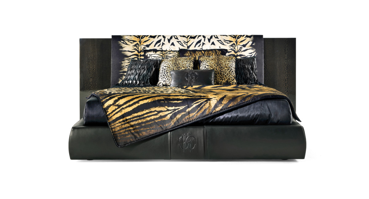 Bold style and rock spirit for Morne, the undisputed star of the room. A bed with a stunning headboard and symbolic details, such as the element of the snake embroidered in central position. The cushions upholstered in the iconic fabrics of the collection complete the set, enhancing its daring character.