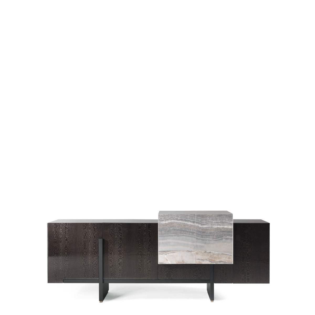 Eye-catching and functional, the Soira sideboard completes the dining room with its refined appeal. Composed of two sculptural volumes made with contrasting materials, the piece is enriched with Roberto Cavalli monogram and has an interior with glass shelves.