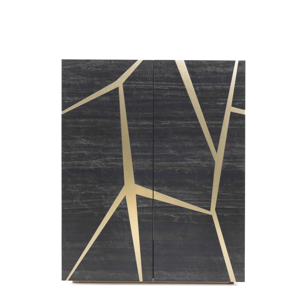 Tonga is a bar cabinet with a linear design and minimalist aesthetic, embellished with metal inserts that evoke the iconic giraffe pattern. Distinguished by a sophisticated manufacturing and sophisticated finishes, it is the result of a complex process of craftsmanship of porcelain stoneware.