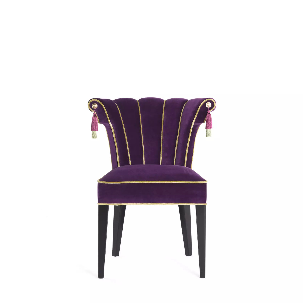 In this original chair, the brand's sophistication and innovative spirit are played with in a fun and extravagant way. The classic lines of the piece meet the irony of the colourful tassels, while the combination of different patterns and fabrics creates a lively and eclectic ensemble.