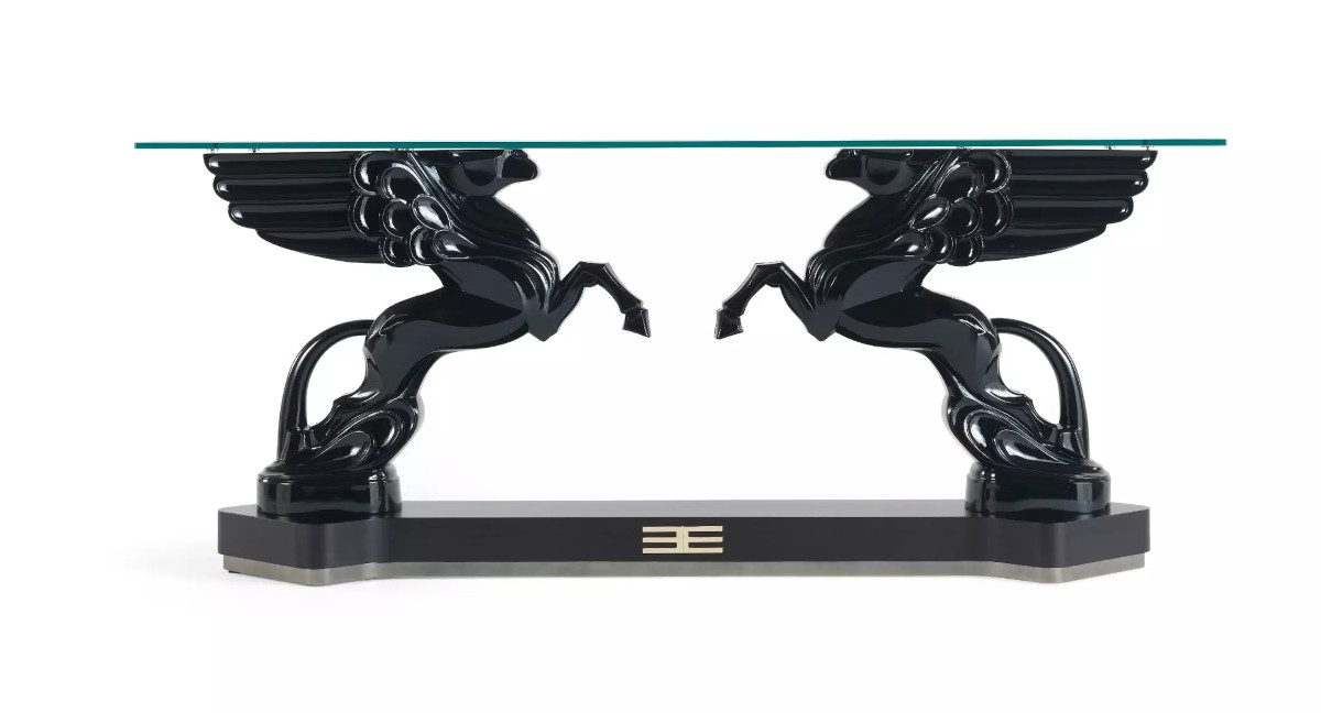 Mythology meets design in Mythos console, a scenographic piece of furniture whose main protagonist is the most famous among the winged horses, Pegasus, the heraldic figure symbol of the Etro brand. Facing each other in a dynamic position and resting on a base that recalls the shape of an arrow, the two mythological animals support the glass top through the play of their wings, visible through the transparency. The brass details of the symbol that recalls the initial letter of the Etro brand, embellish and illuminate the whole giving the table an eclectic charm, in perfect Etro Home Interiors style.