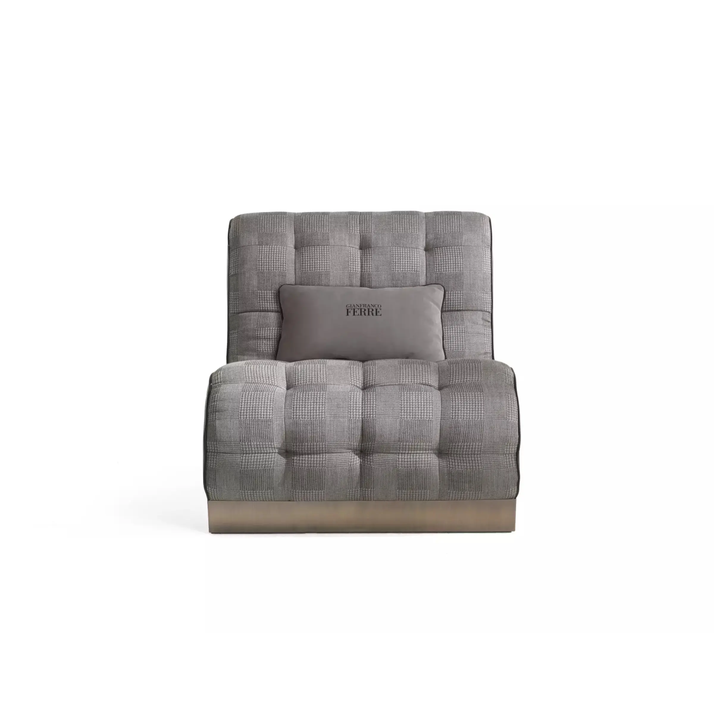 An original and comfortable shape for Bonnie_2.0: halfway between an armchair and a chaise longue, it is characterized by the backrest that continues on the seat and on the lower part, replacing the legs in the front. The oblique rear legs with bronzed lacquered tips add an intriguing vintage note, while the upholstery available in the different fabrics of the collection is in line with Gianfranco Ferré's deepest identity.
