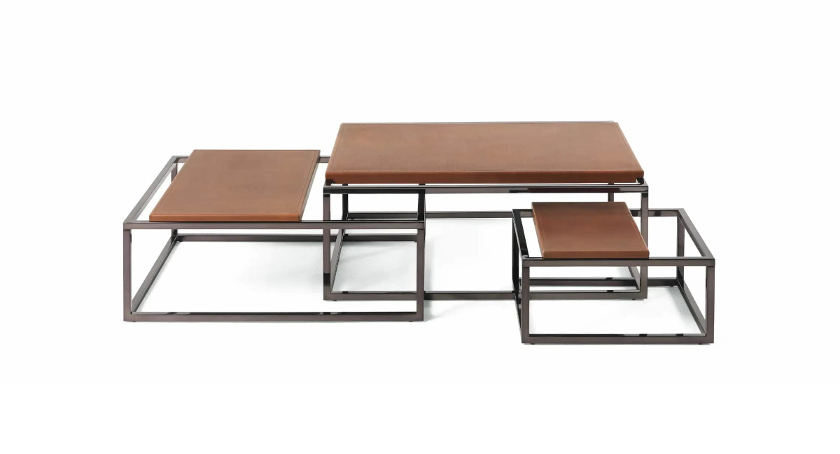 A scenographic table with a strong visual impact. A contemporary design language, based on lightness and essentiality, turns into a complex play of geometric elements, with different heights and dimensions. Evolution of the Matrix bookcase, the table features a black chrome finishing and adjustable shelves covered in saddle leather with stitching on borders, according with the new mood permeating the collection.