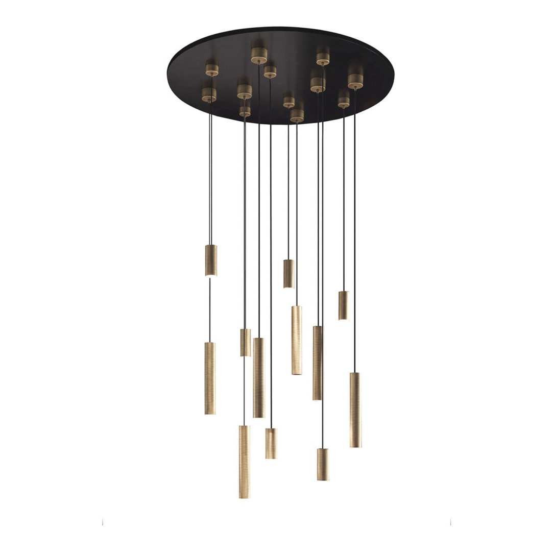 Suspension lamp with cylindrical rosette in brushed bronze varnished aluminium. Black plastic-covered wire supporting the weight of the light- generating body, which is composed of an aluminium cylinder in brushed bronze varnished aluminium. Adjustable for personalized installations. Double height light generating bodies: 16 and 40 cm. Natural halogen light.