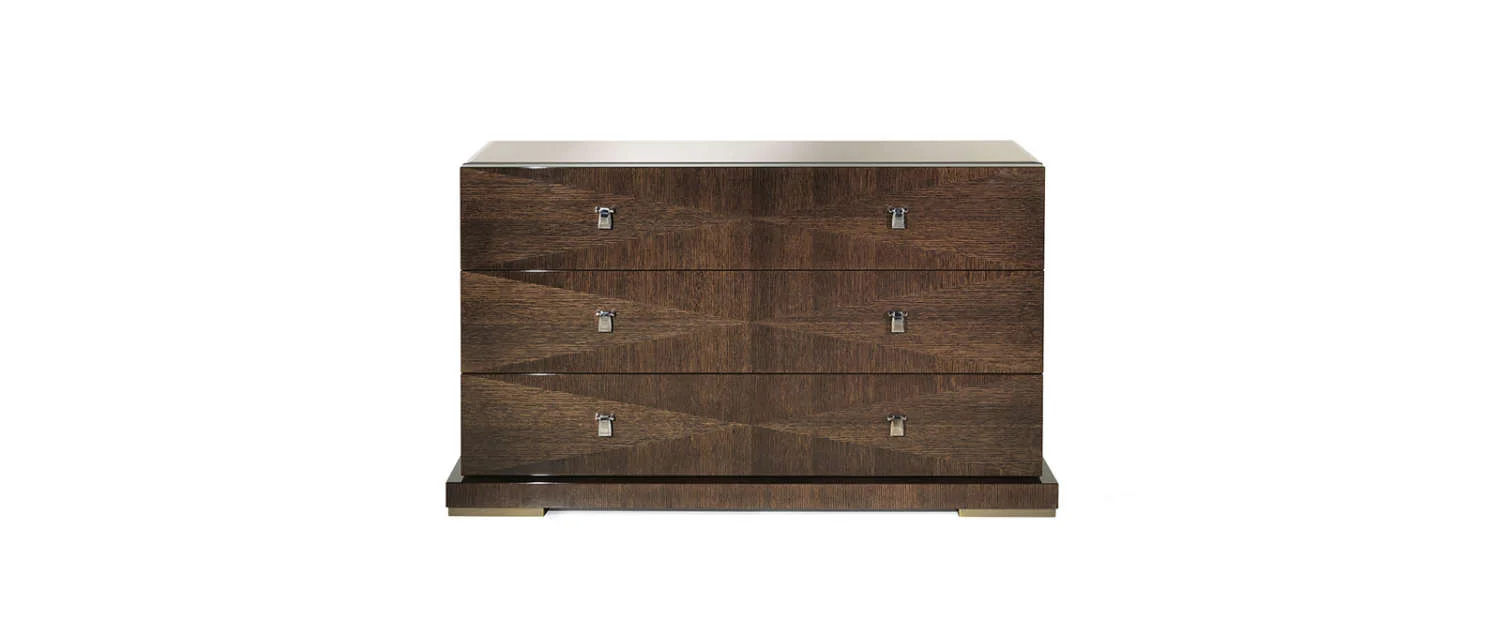 Structure in multi-layer wood. Top sides and one door in bevelled natural or bronze mirror. Drawers and base in oak col. glossy wengè or glossy ebony finishing. Inside finishing in microfiber. RC logo and "jewel handles" in melted brass available in platinum or golden finishing.