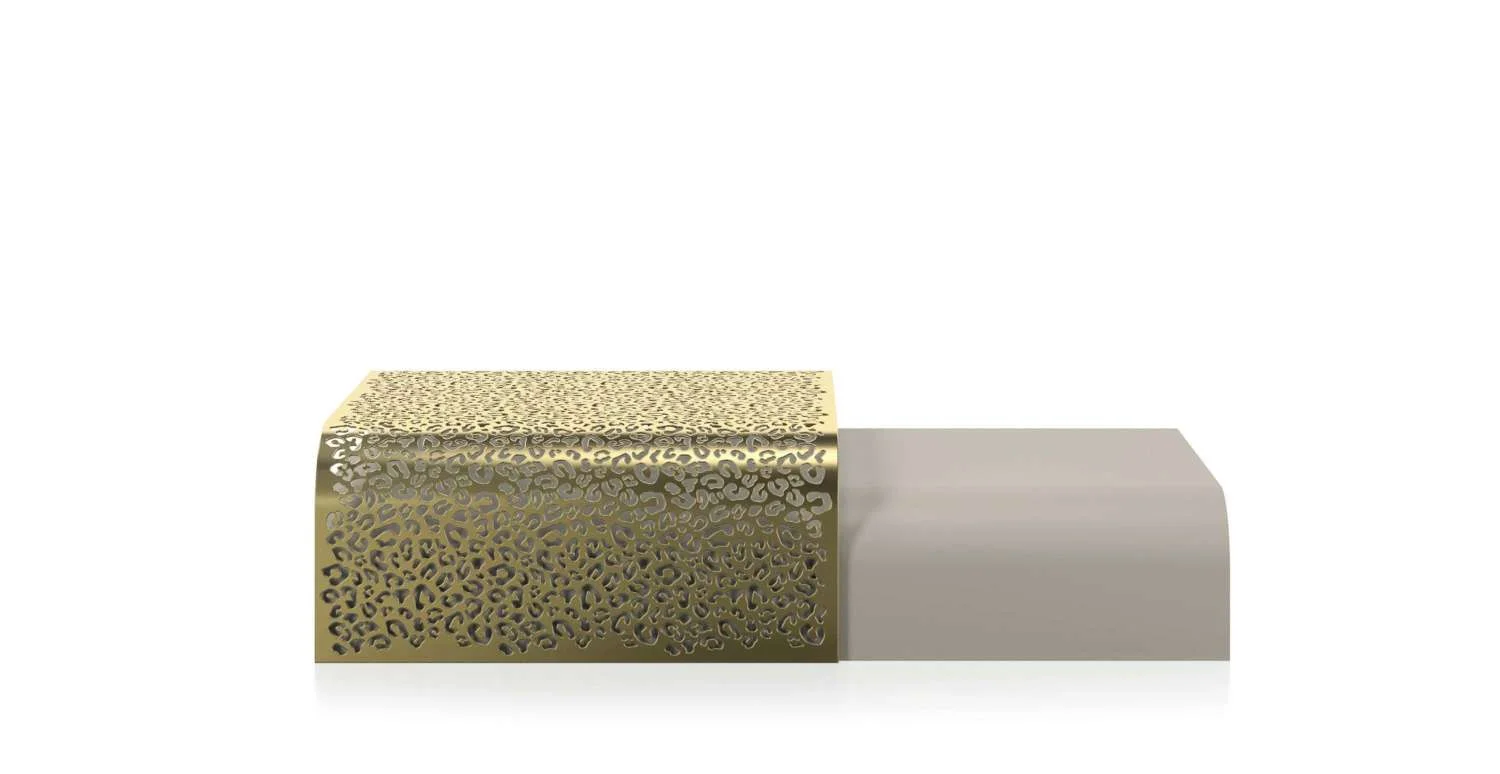 The essential and minimalist lines of the composition are enriched by the exuberant and sophisticated decorativism, typical of Roberto Cavalli Home Interiors brand: one of the two elements is in animalier laser-cut, while the other one is in glossy lacquered wood.